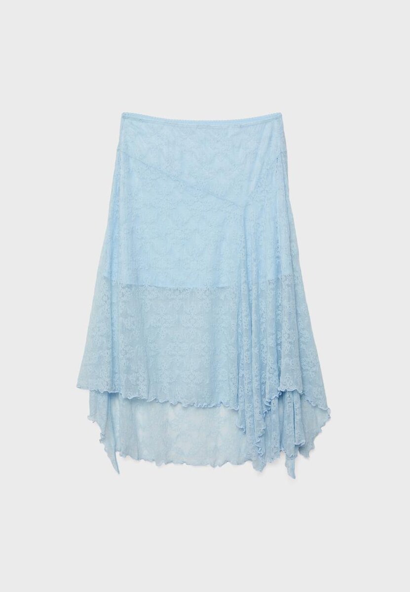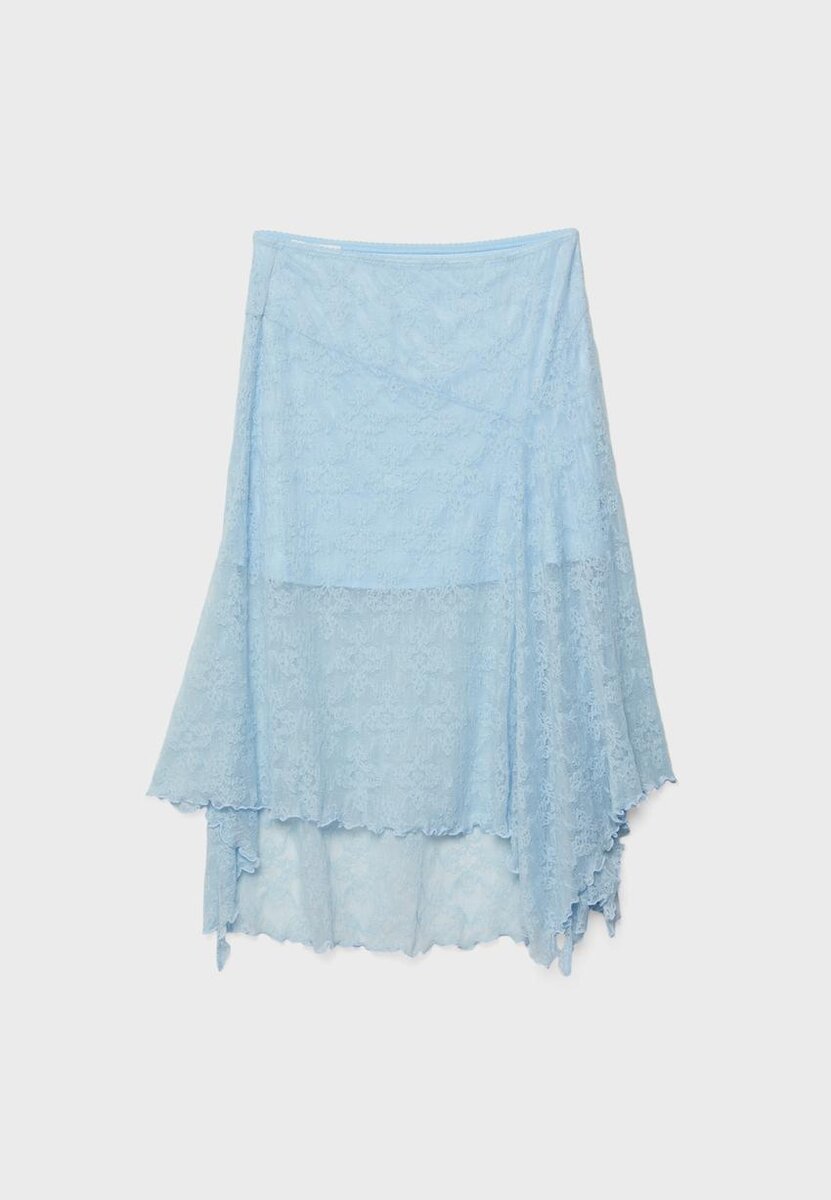 Flytende midi-skjørt laget av blondestoff med matchende fôr. Middelhøy midje med elastisk linning og asymmetrisk kant.