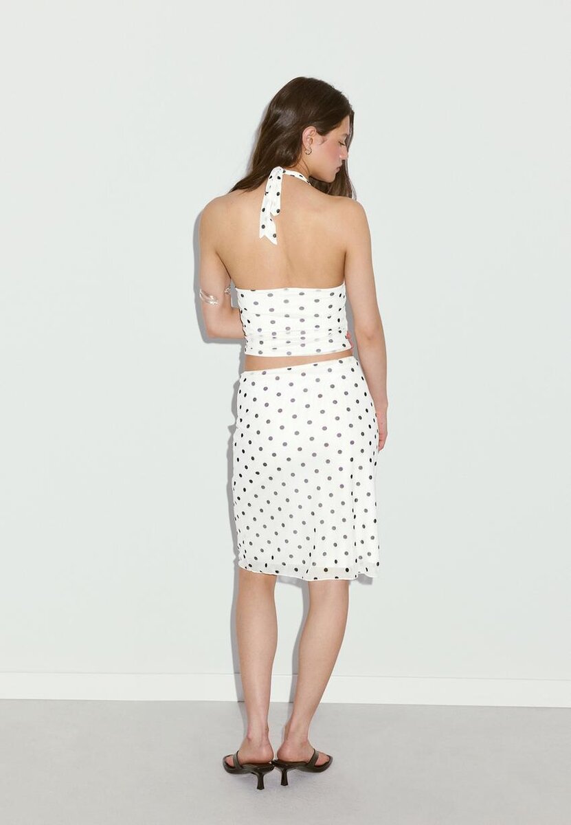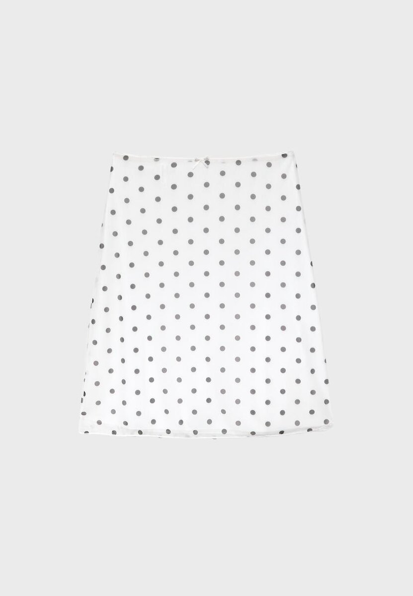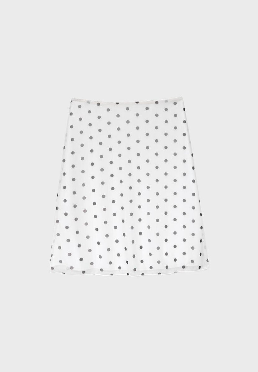 Midi-skjørt med midje og elastisk linning, laget av tyllstoff med mønstret mønster.