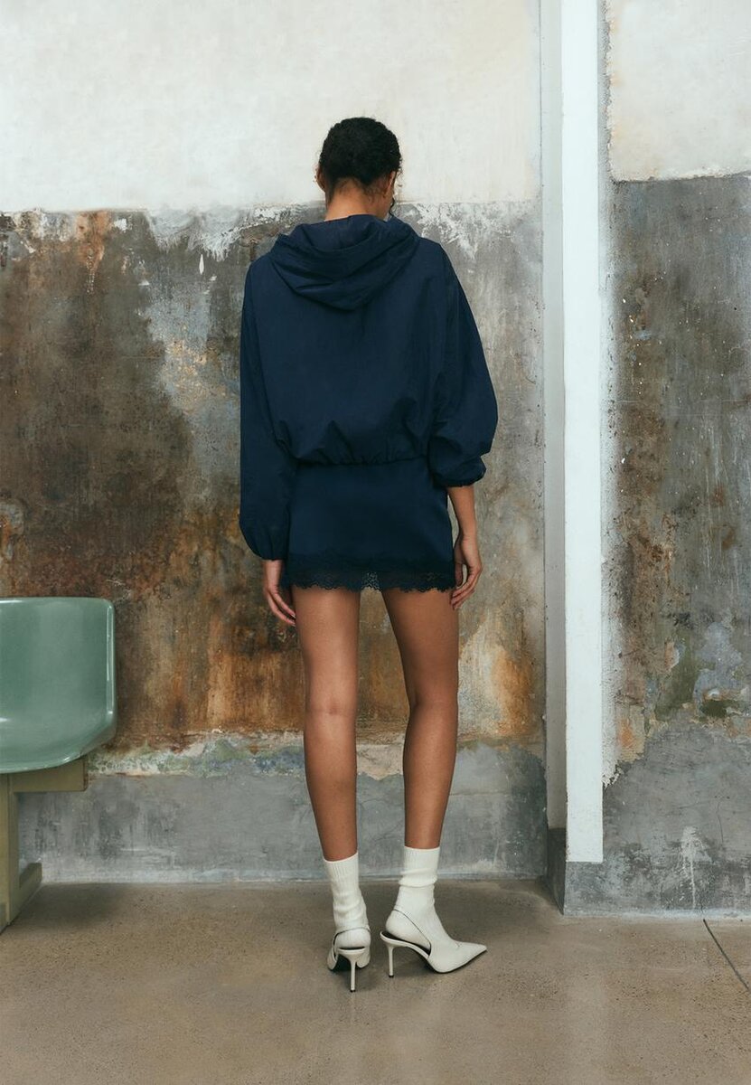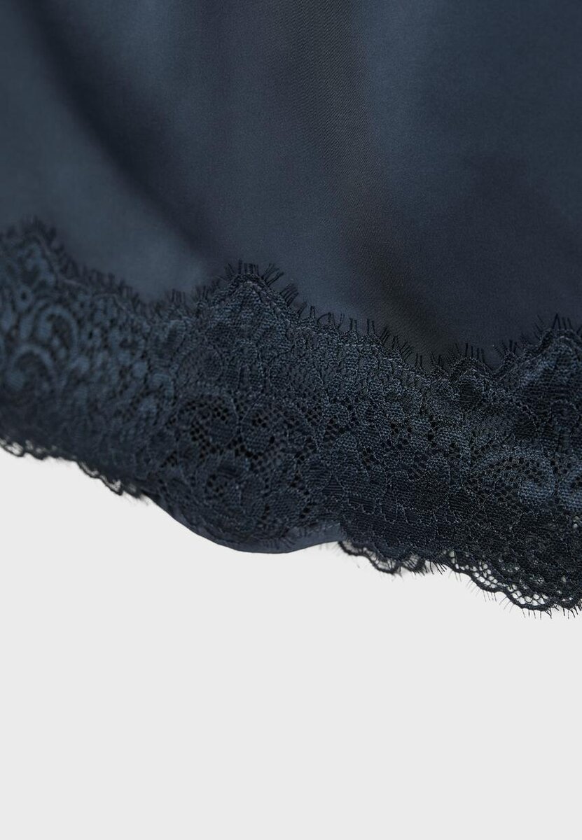 Miniskjørt med middels høy midje laget av stoff med satengeffekt. Usynlig glidelås i siden. Har kontrastfarget blonderkant nederst på skjørtet.