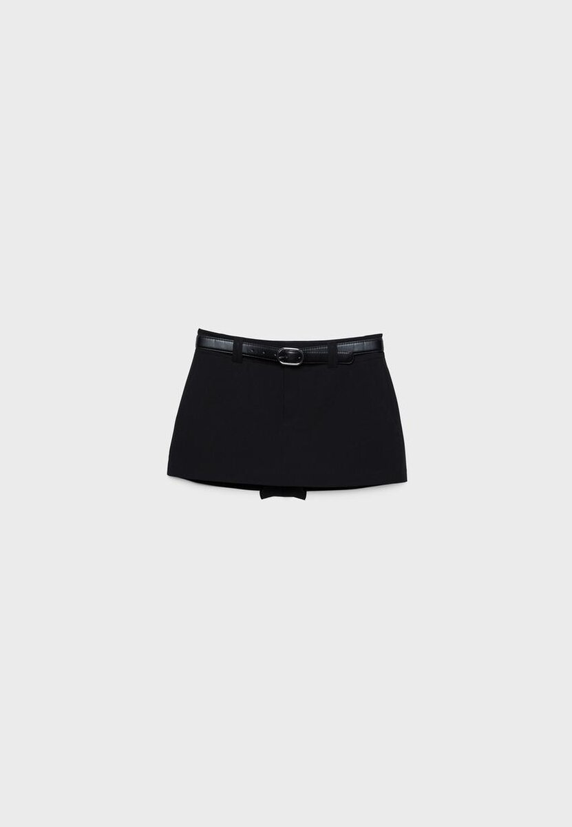 Miniskort med midjehøyde og beltestropper. Avtakbart kontrastbelte med metallspenne. Sidelukking med usynlig glidelås. Fôr i innvendige shorts.