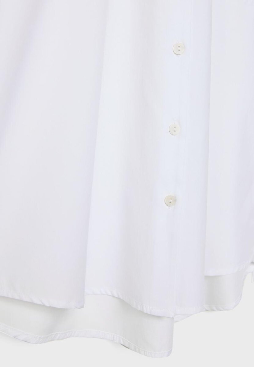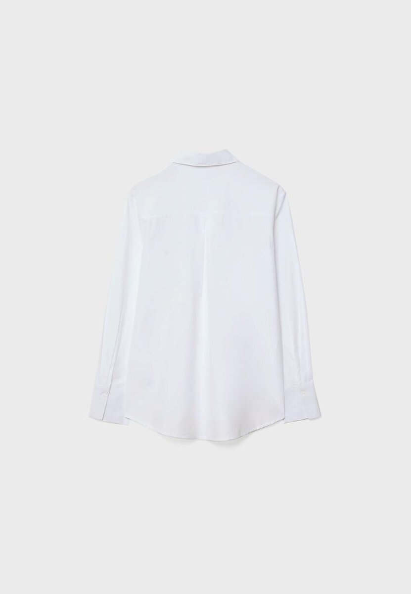 Skjorte med krage, rett passform, lange ermer og mansjetter med knapper. Med påsydd brystlomme, asymmetrisk kant og knapper foran.