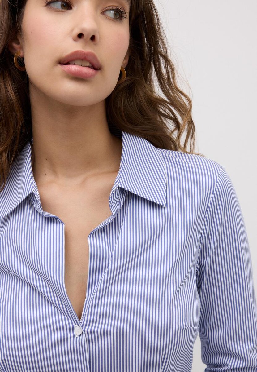 Tettsittende skjorte med reverskrage og V-hals, med lange ermer med mansjetter. Tilgjengelig i ulike farger.