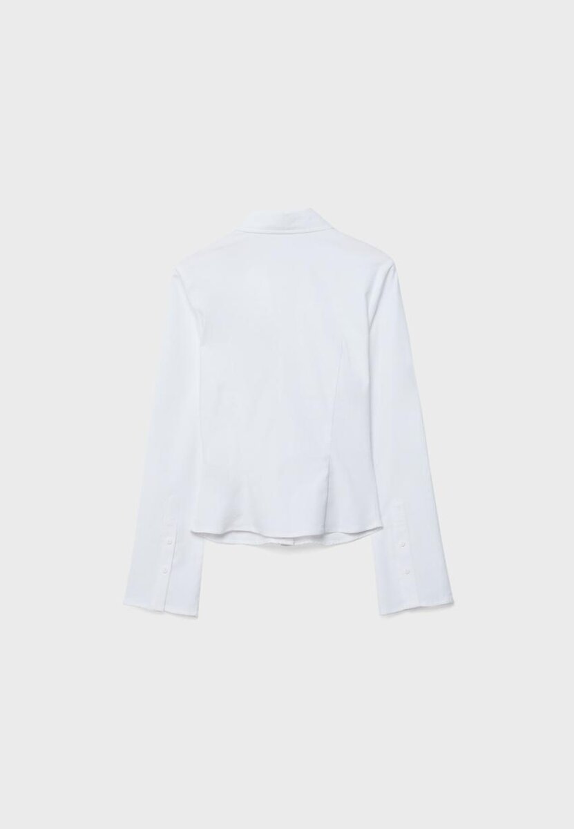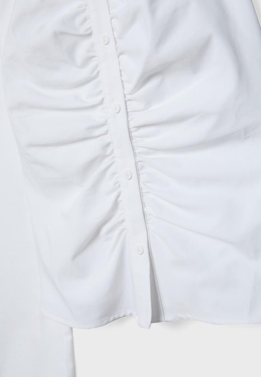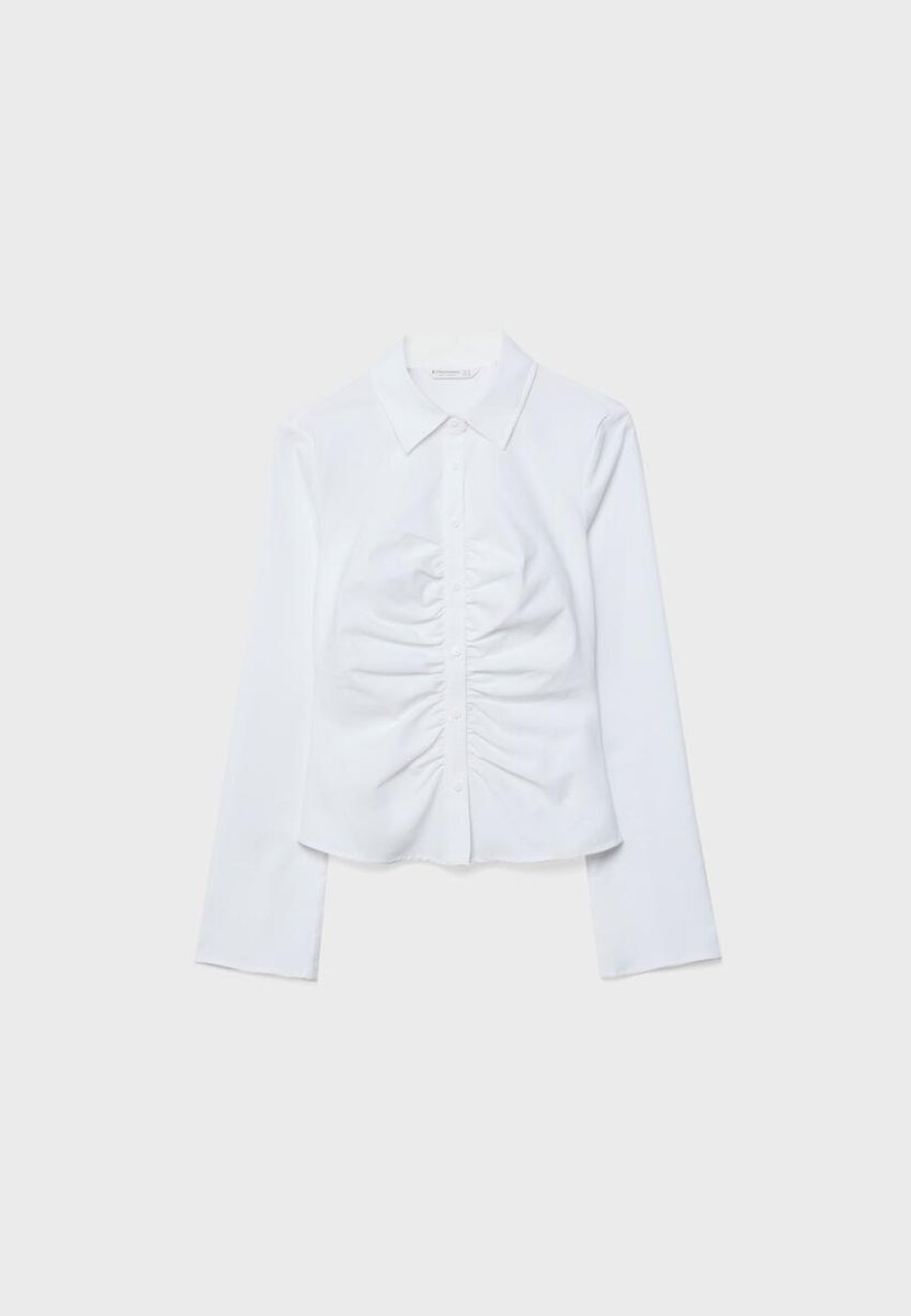 Tettsittende skjorte med reverskrage og lange ermer. Knapper foran. Rynket stoffdetalj foran. Tilgjengelig i ulike farger.