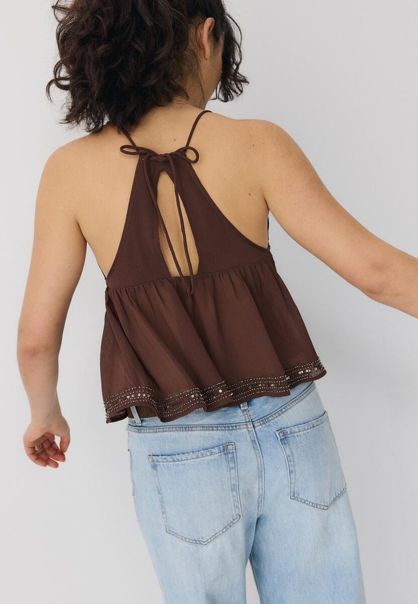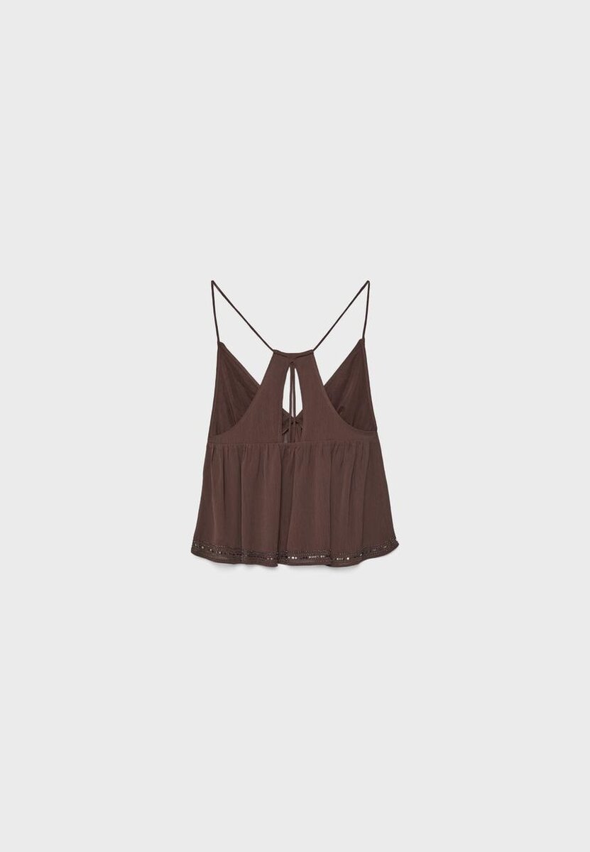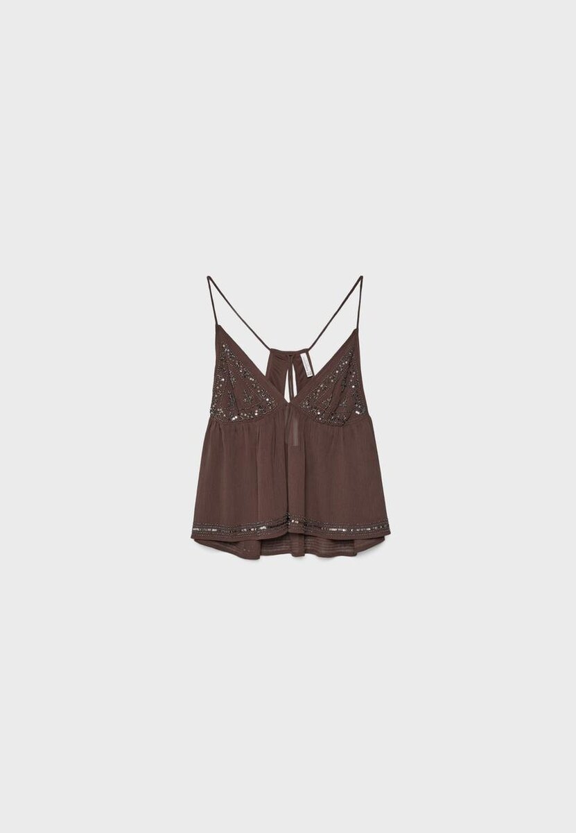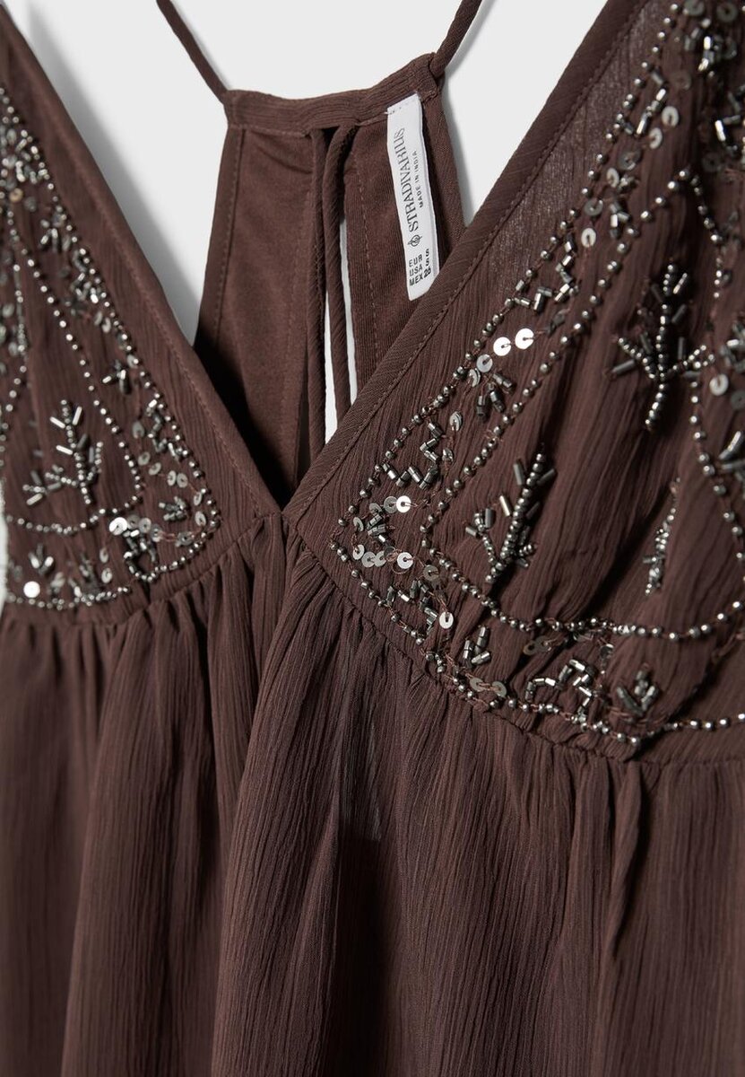 Løst sittende topp med V-hals og tynne stropper. Med broderte detaljer.