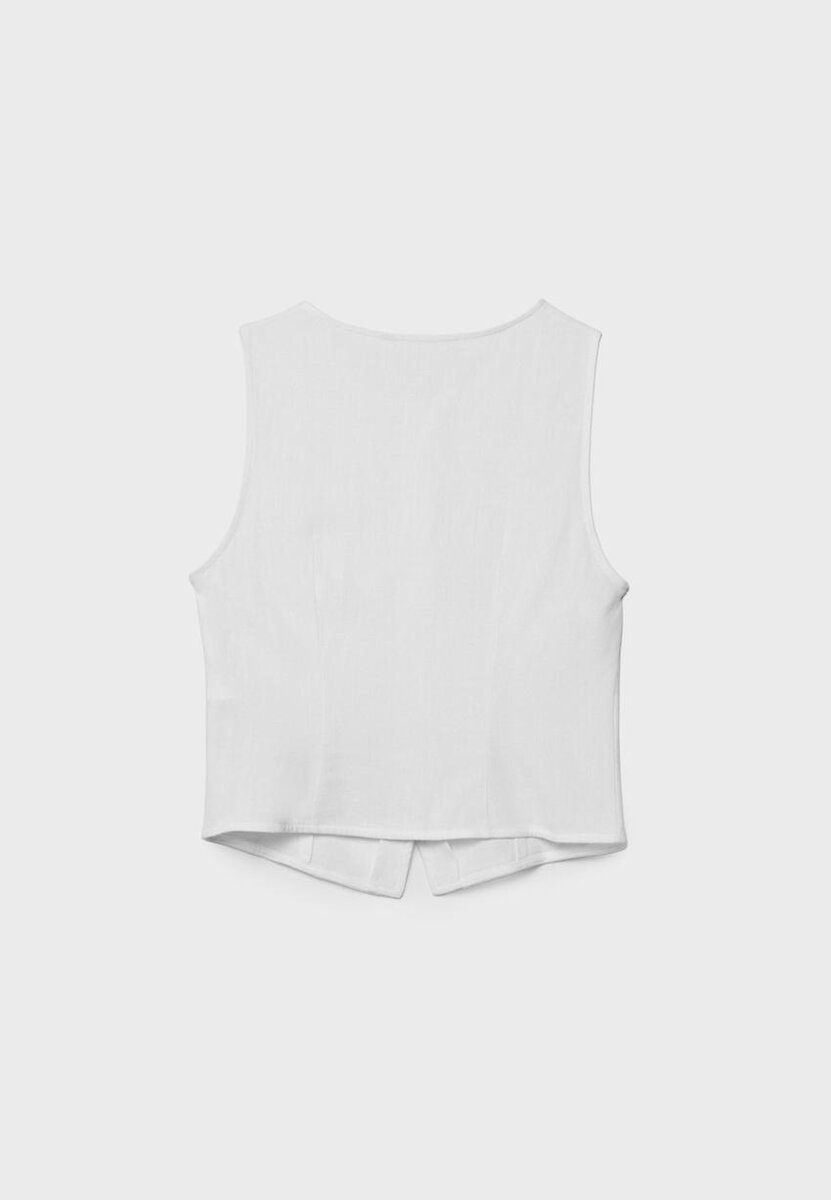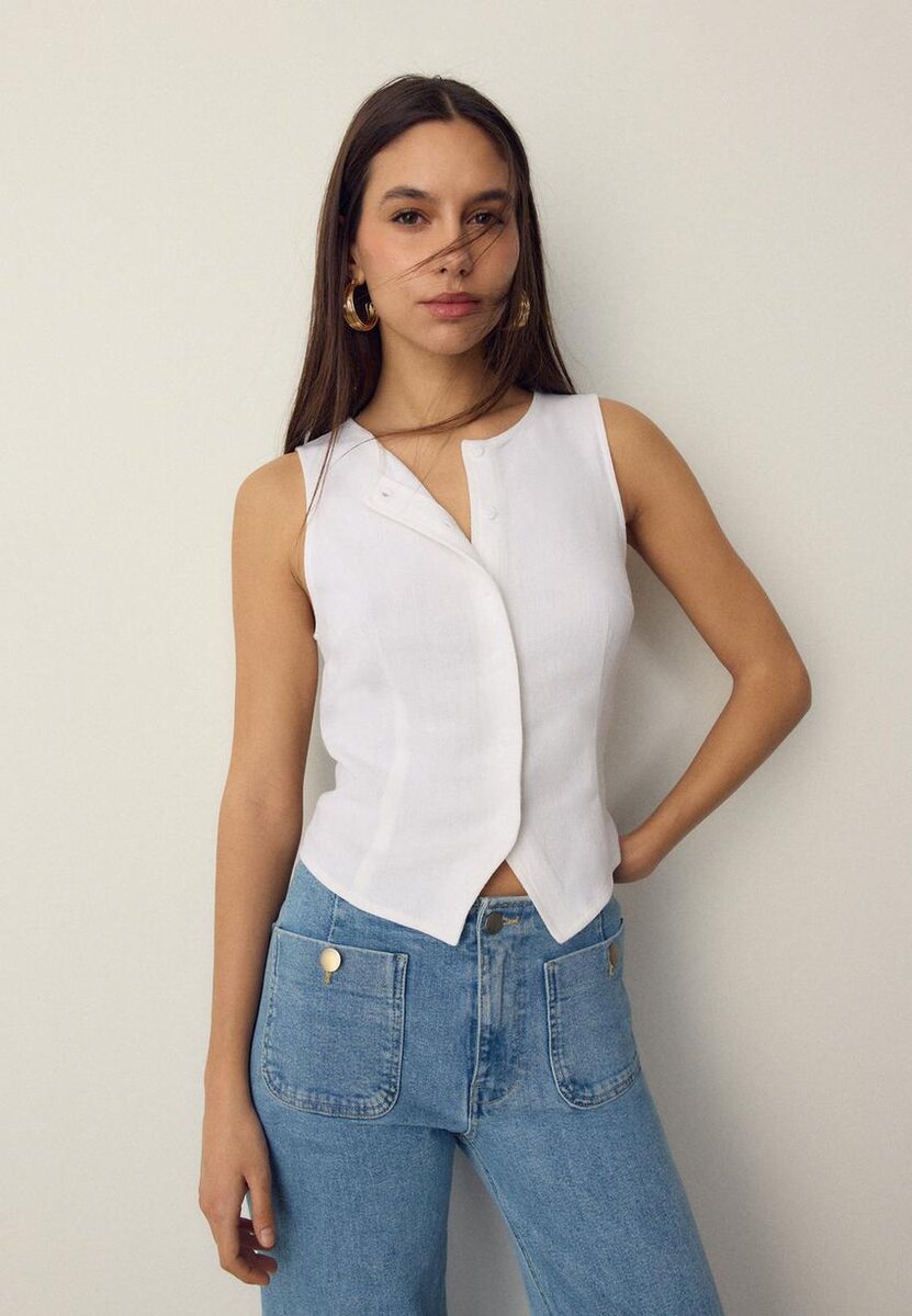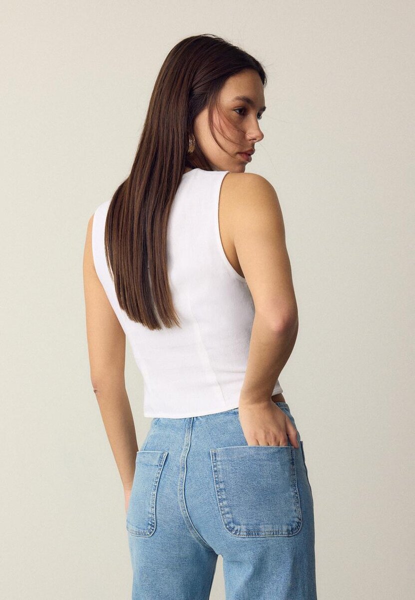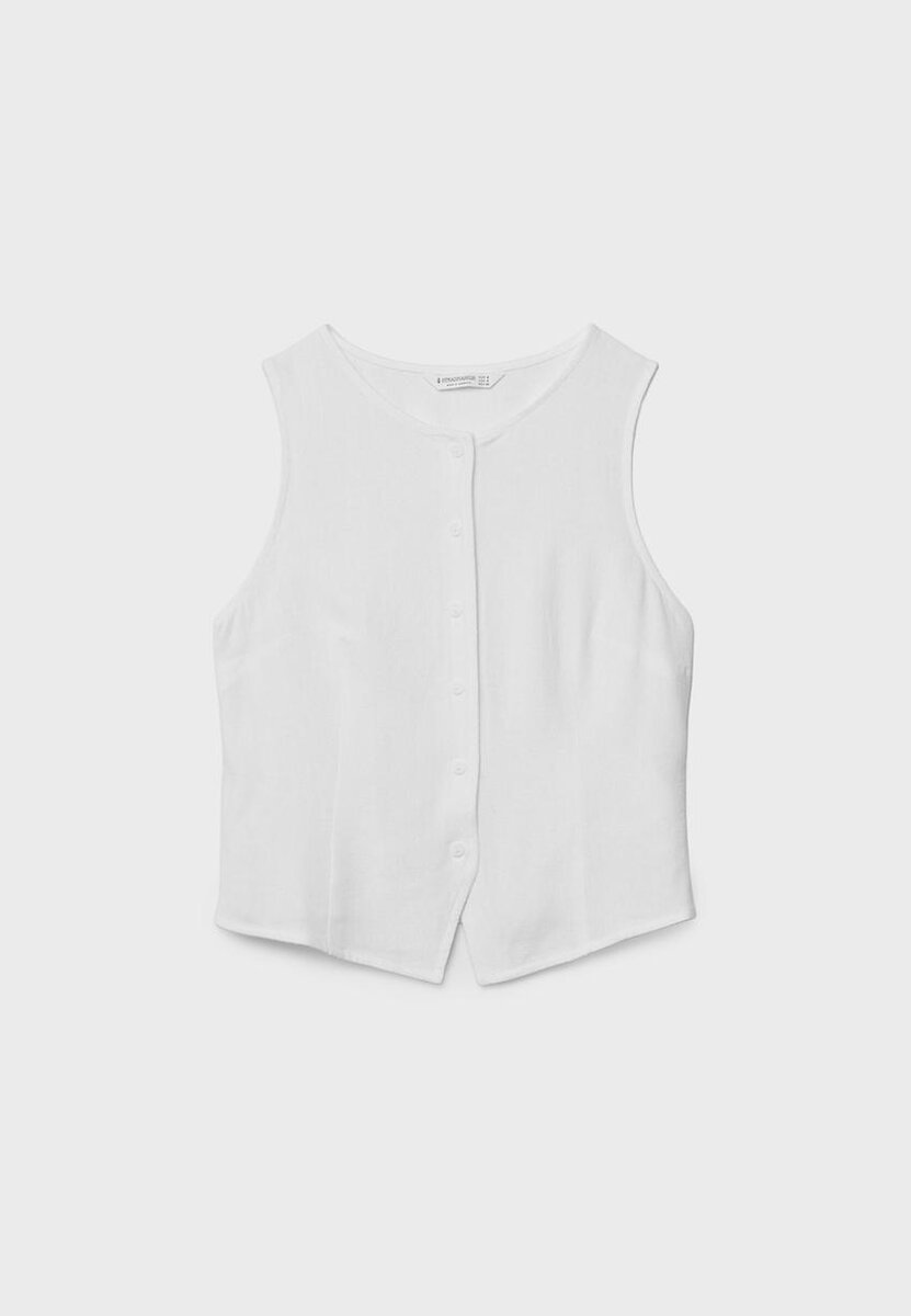 Tettsittende, ermeløs topp med rund hals. Lukking foran med tone-i-tone-knapper. Tilgjengelig i flere farger.