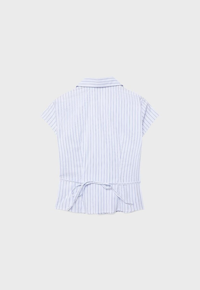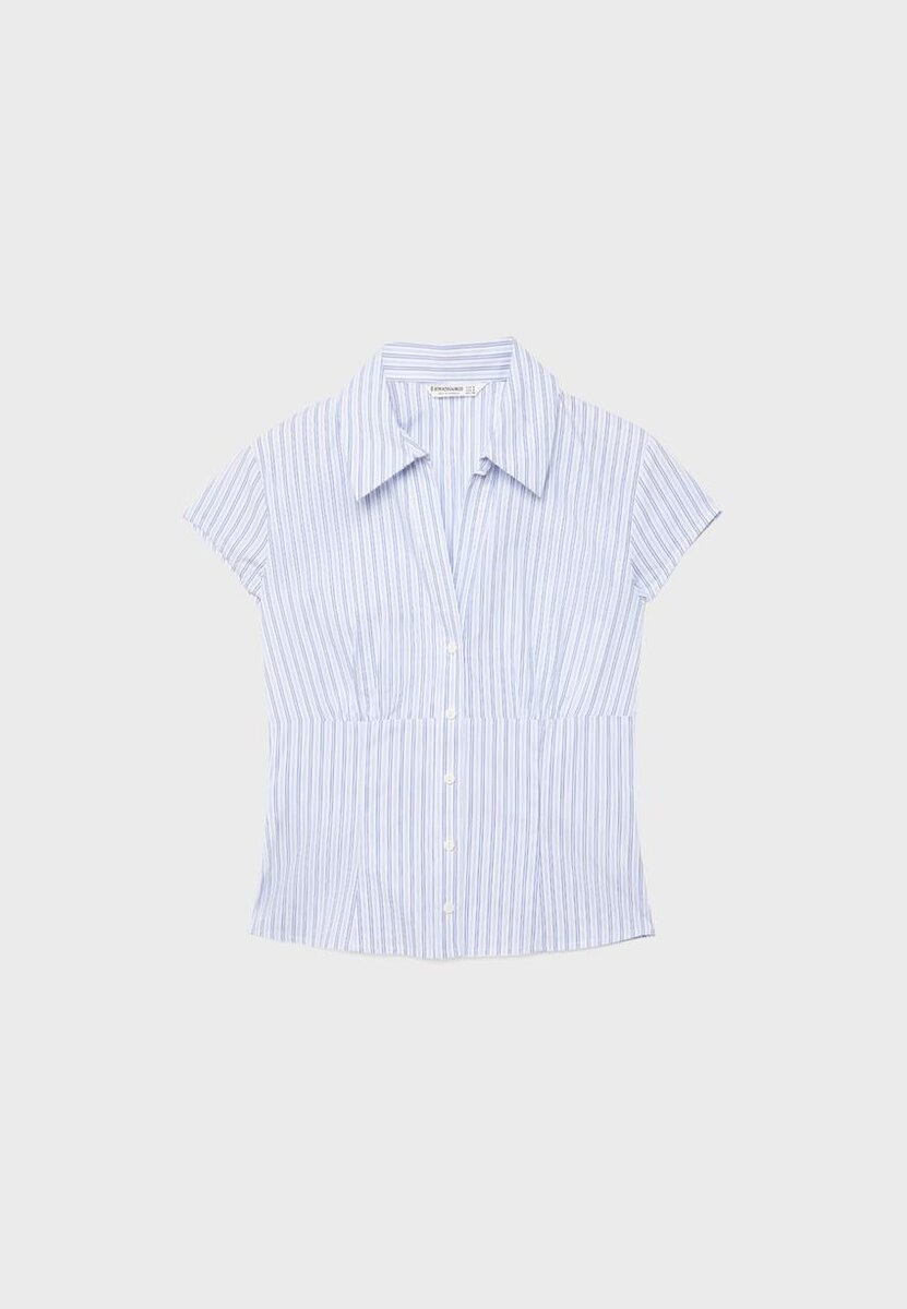 Skjorte med krage, V-hals og korte ermer. Knapper foran. Med søm under brystet og innsvingt midje. Tilgjengelig i flere farger.