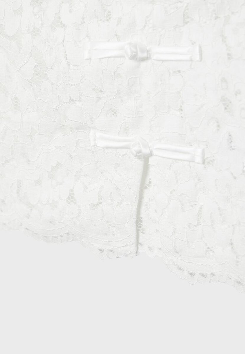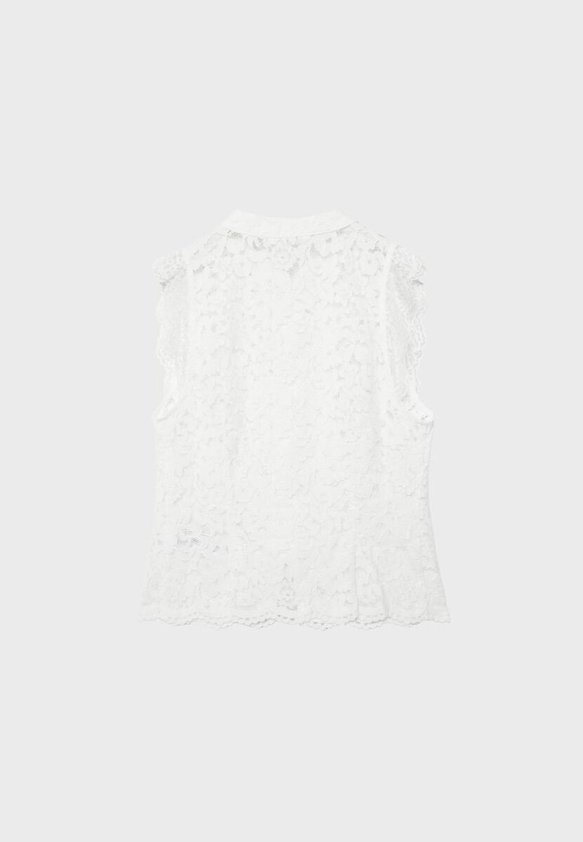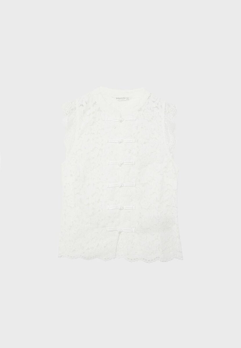 Qipao-top laget av blondestoff. Har høy hals og kappeærmer. Knappestolpe foran. Tilgjengelig i flere farger.