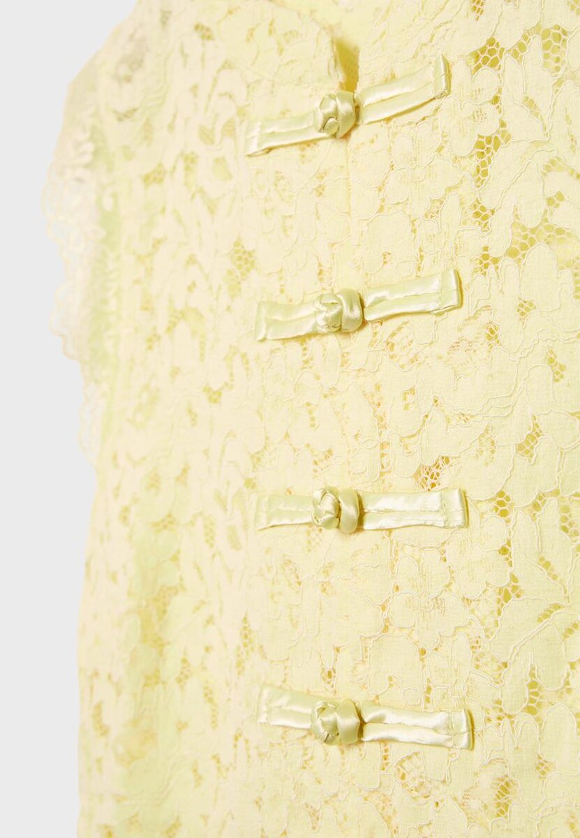 Qipao-topper laget av blonder. Har høy hals og kappeærmer. Knappestolpe foran. Tilgjengelig i flere farger.