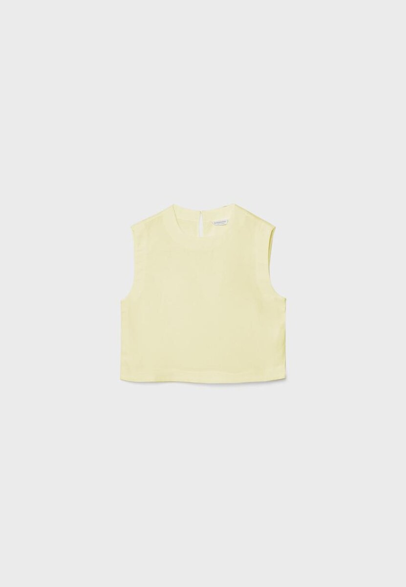 Top i rustikt stoff med 18 % lin. Med rund hals og ermeløs design. Knappestenging med spalte på baksiden. Rett kant.