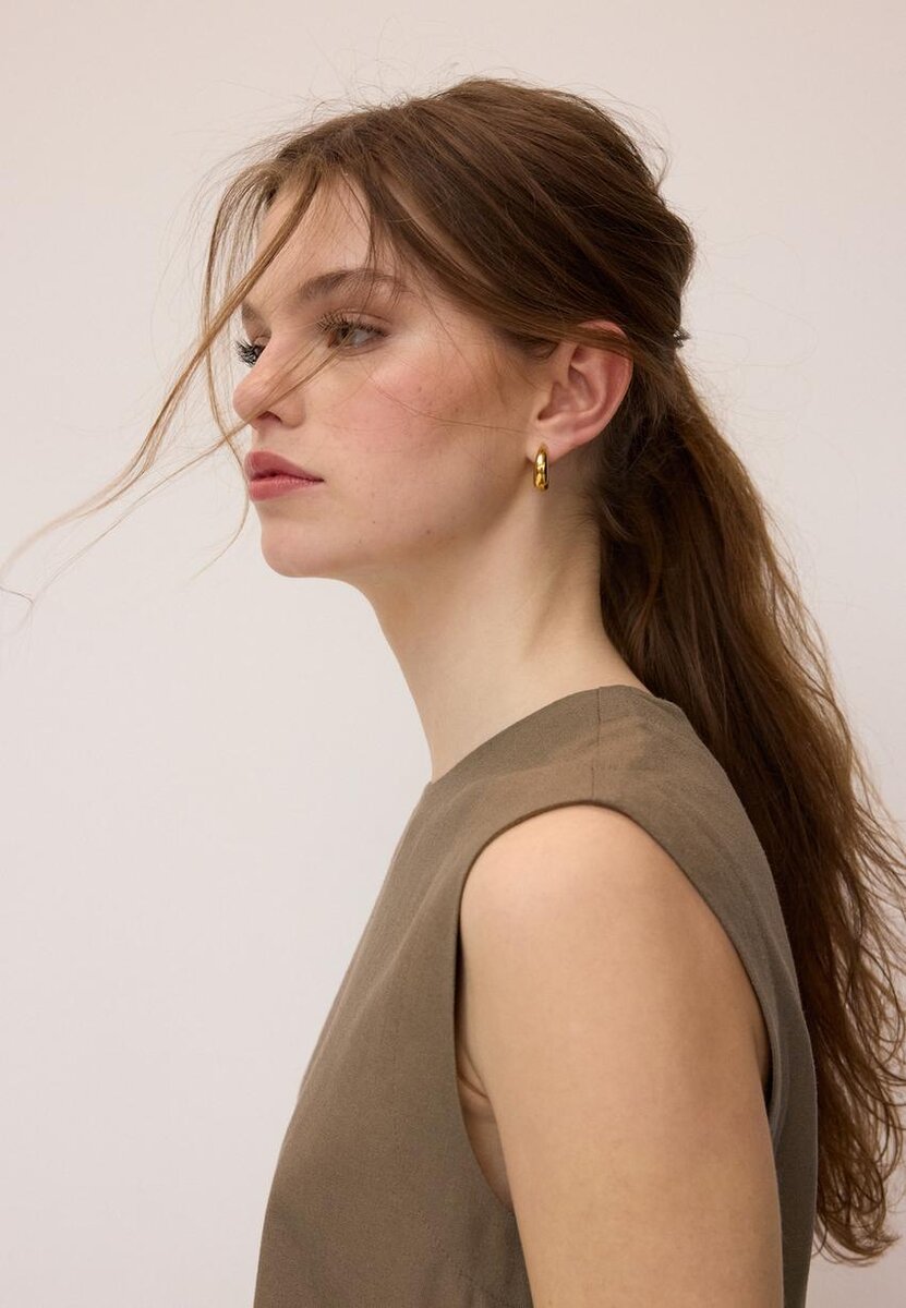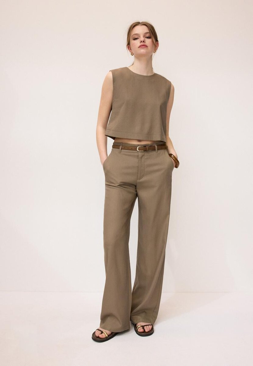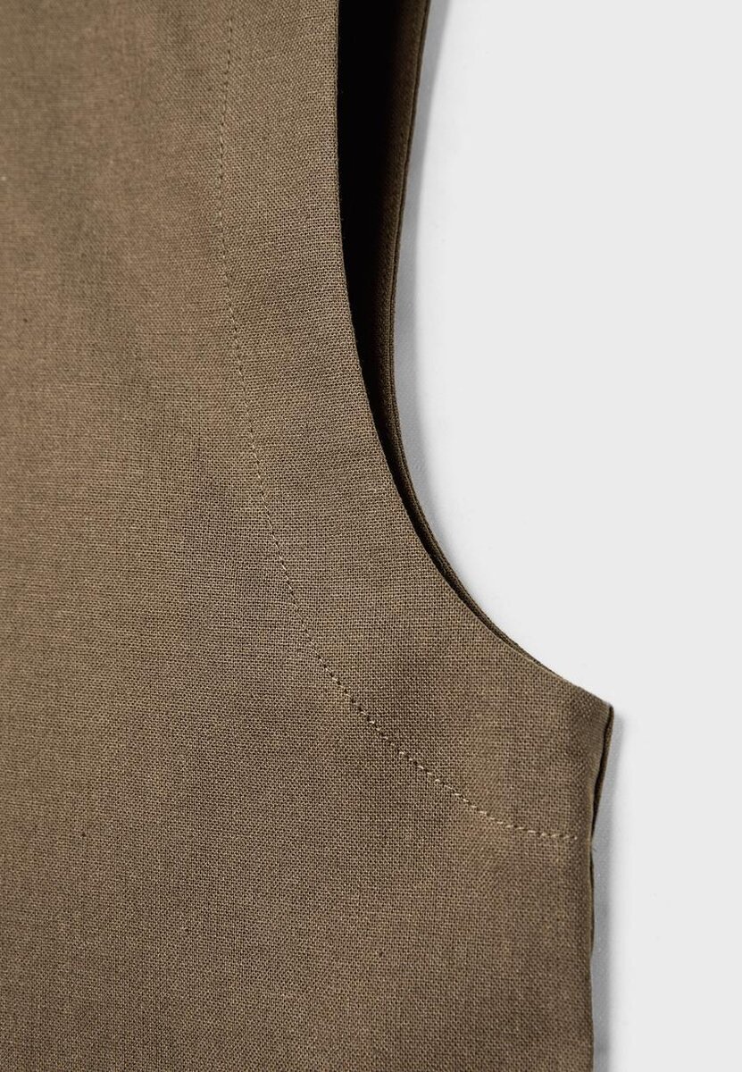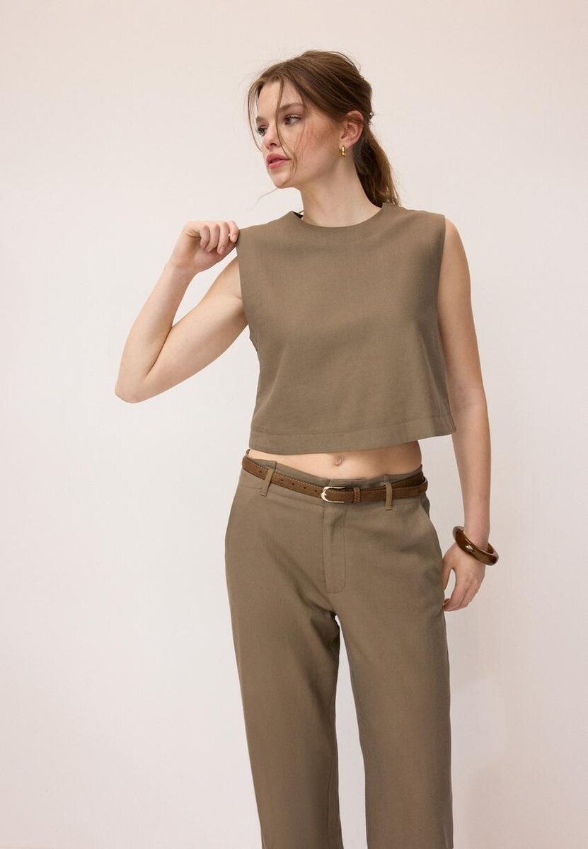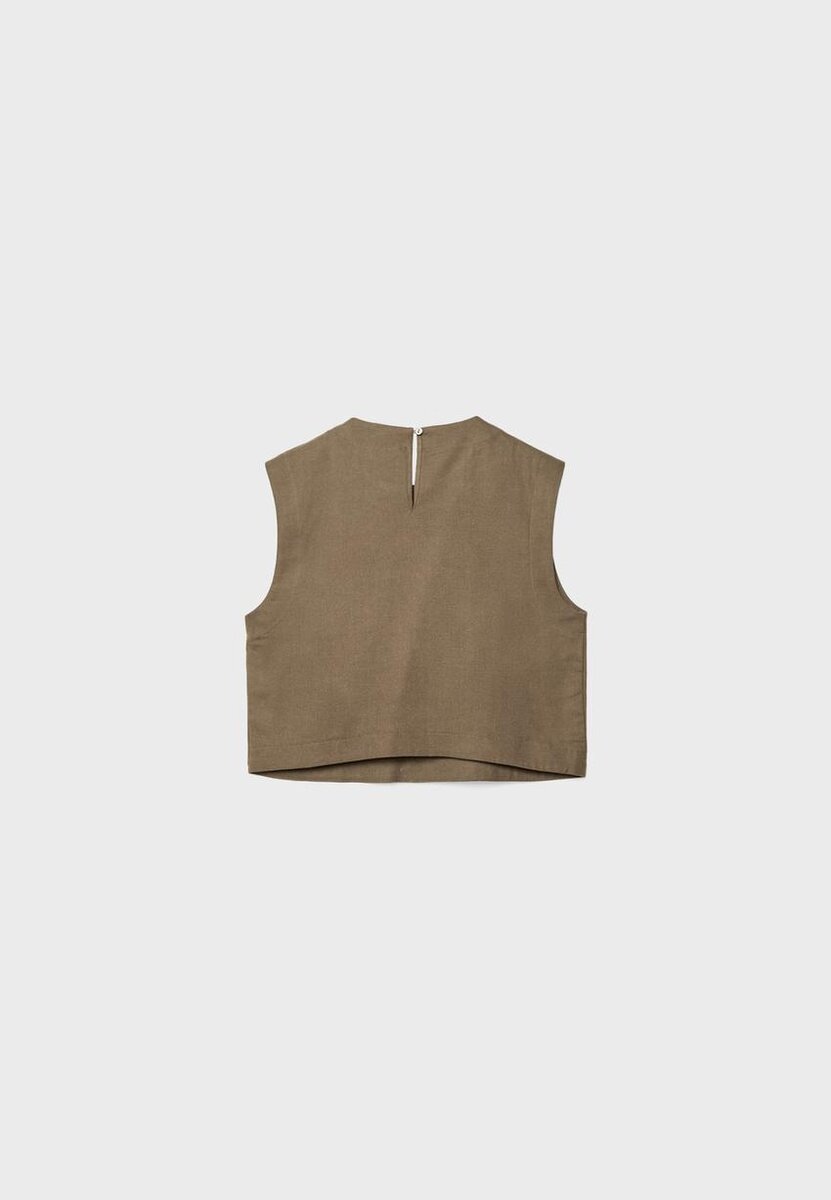 Top laget av et stoff med 18 % lin. Med rund hals og ermeløs design. Spalte på baksiden med knappelukking. Rett kant.