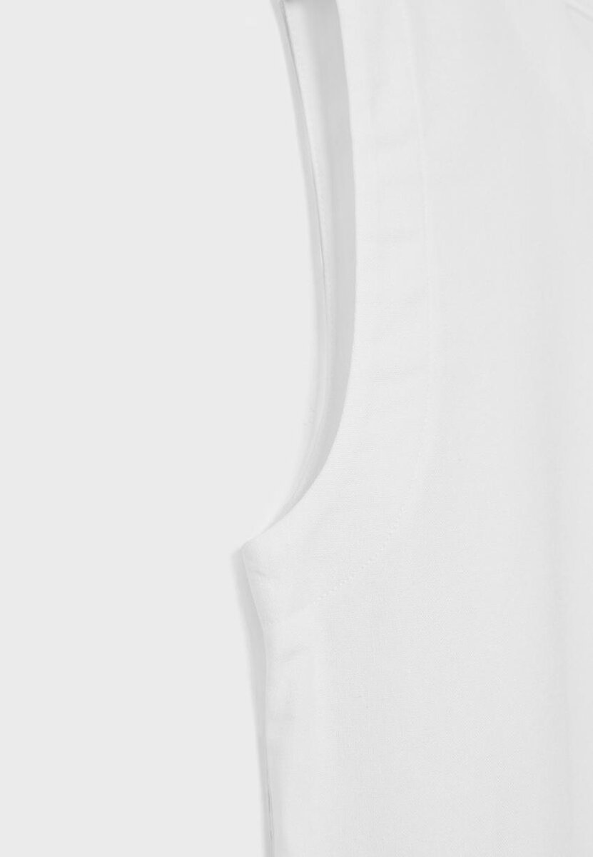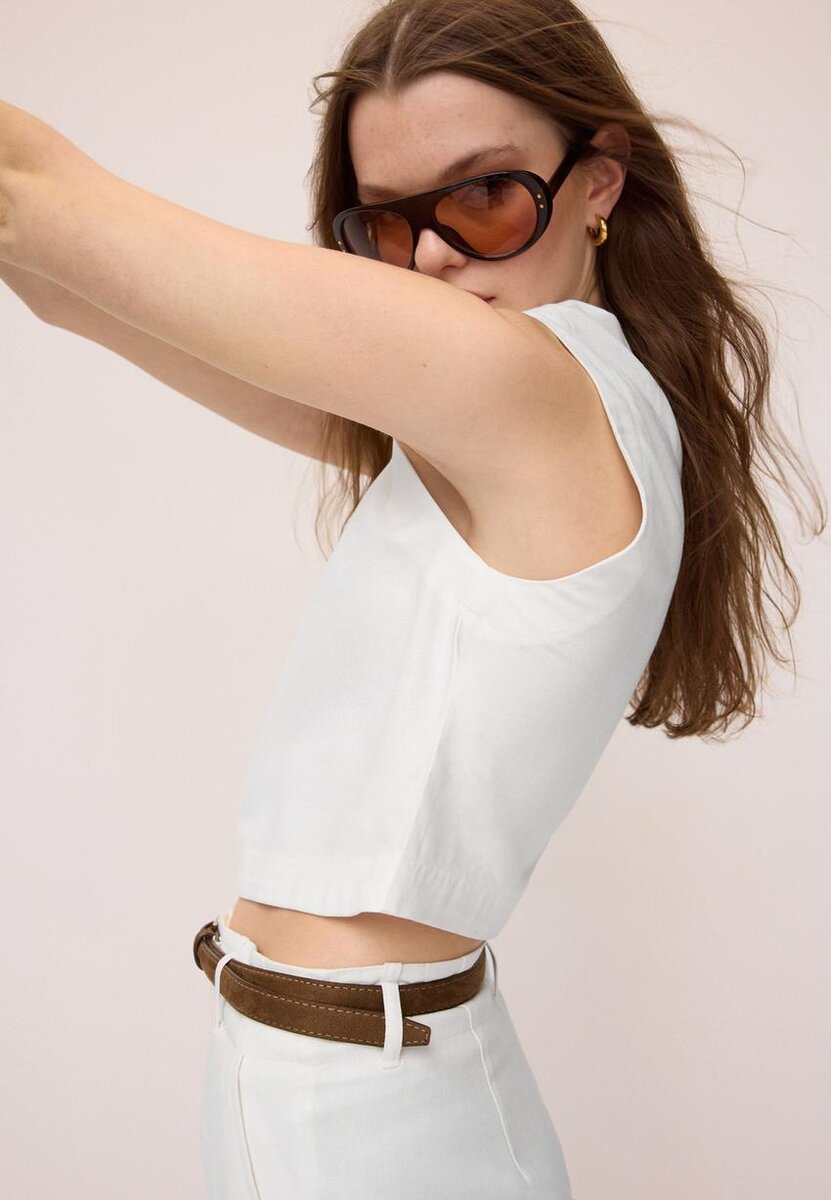 Top laget av rustikt stoff med 18 % lin. Har rund hals og ermehull. Detalj med spalte på baksiden med knappelukking. Rett kant.