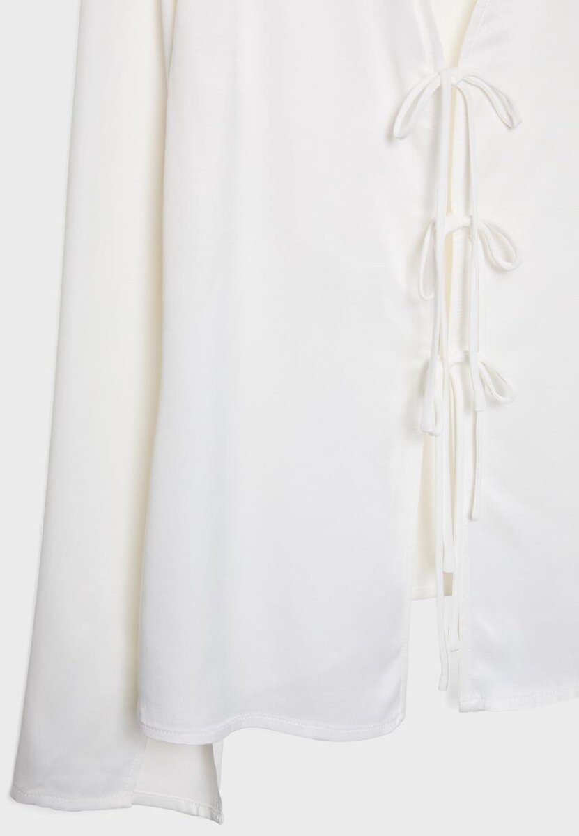 Skjorte laget av stoff med satengeffekt. Reverskrage med V-hals og lange ermer. Båndlukking foran.
