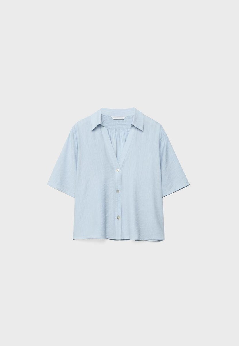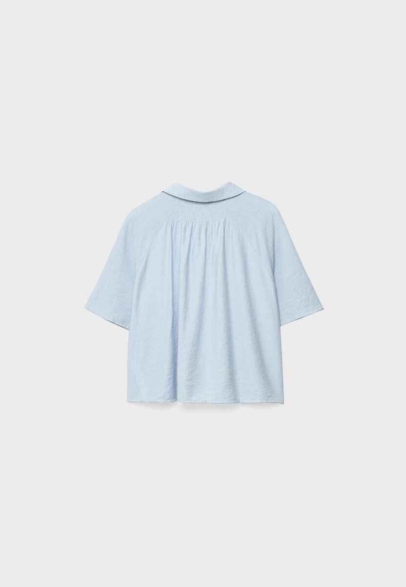 Løs skjorte med krage og korte ermer. Med knapper foran og detaljer i bikakemønster på ryggen. Tilgjengelig i flere farger.
