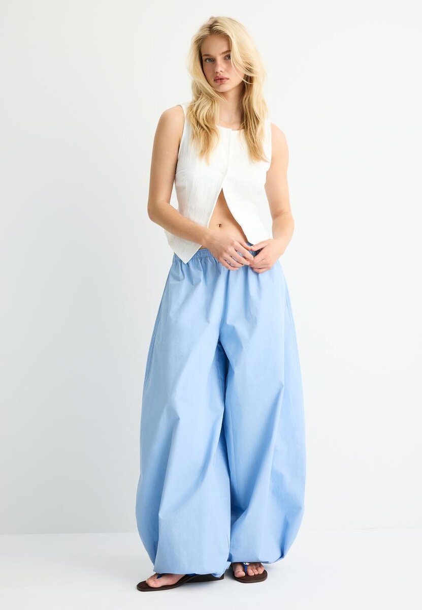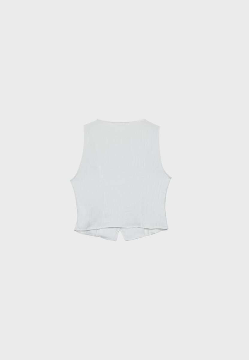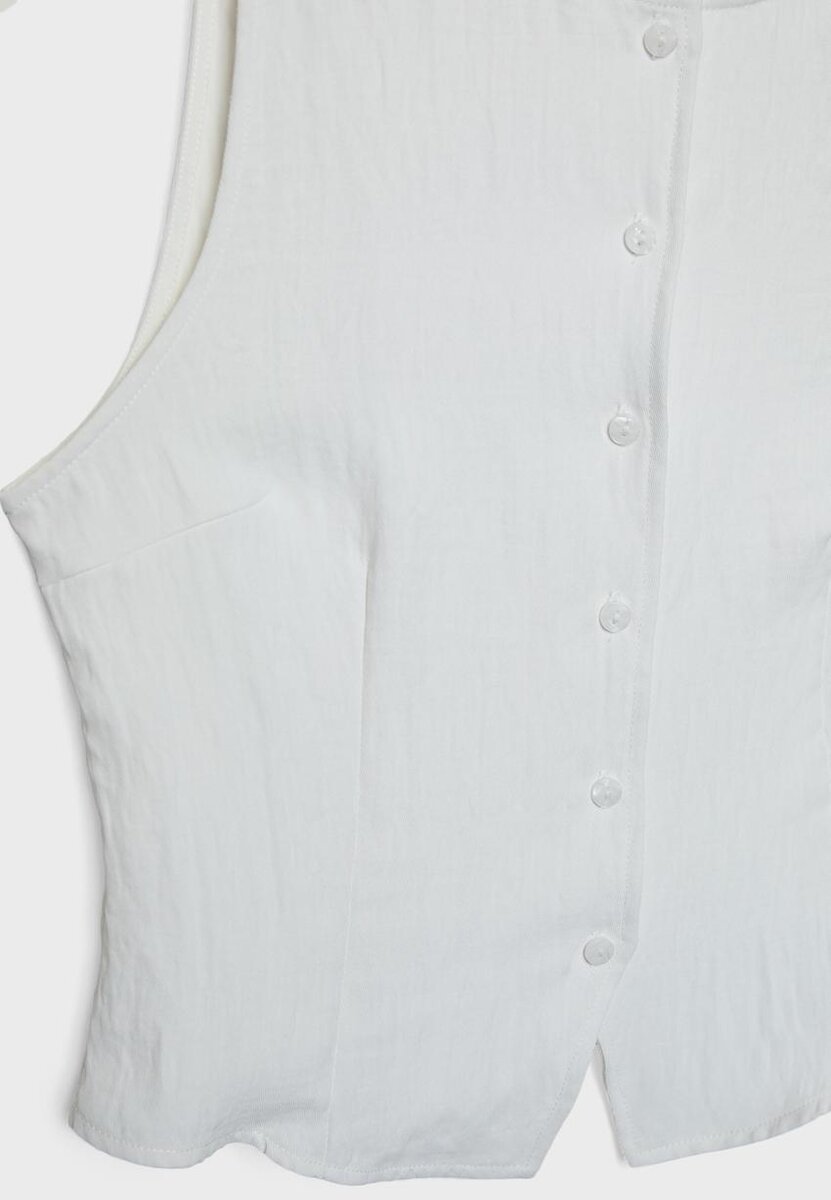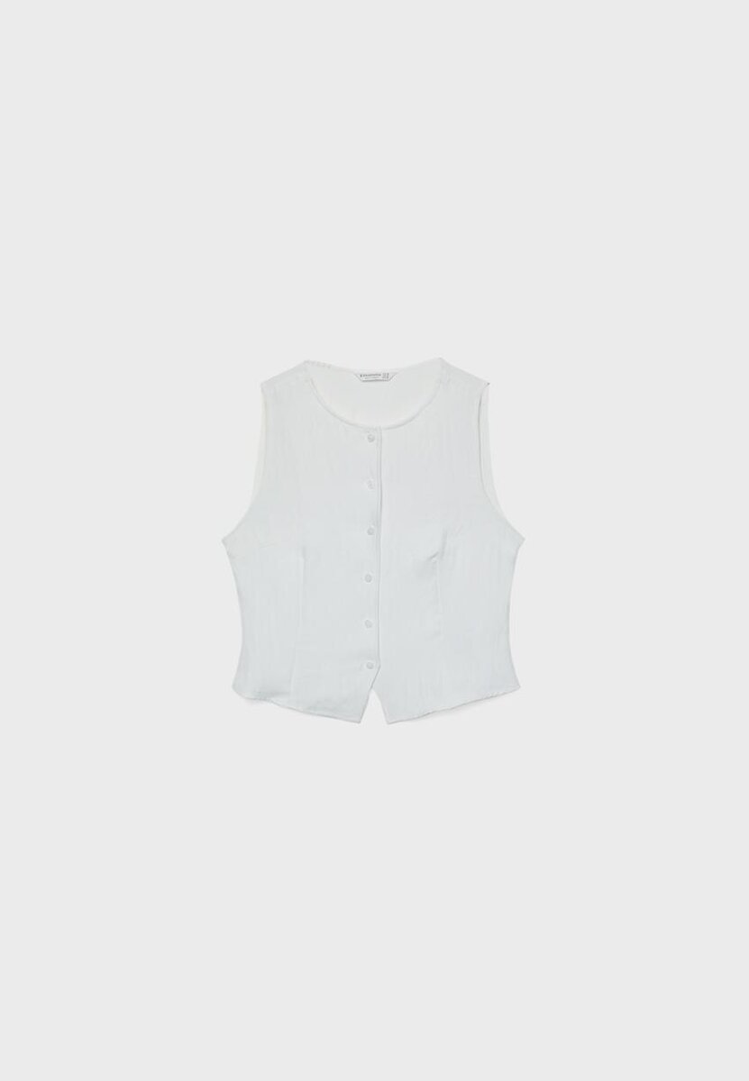Ermeløs topp laget av en viskoseblanding. Rund hals. Spalte foran i nederkant. Stoffdetaljer med krøllet tekstur. Lukking foran med matchende knapper. Tilgjengelig i flere farger.