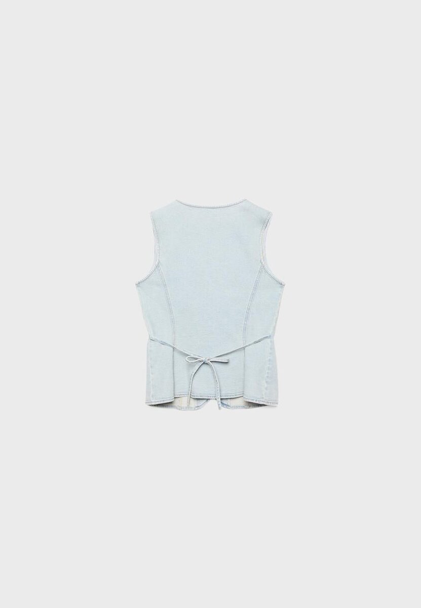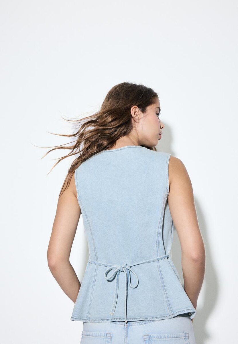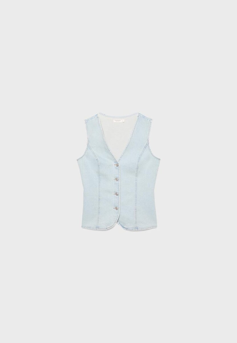 Tettsittende topp i veststil av denim. Med V-hals og ermeløs design. Knappestenging foran. Tilgjengelig i flere farger.