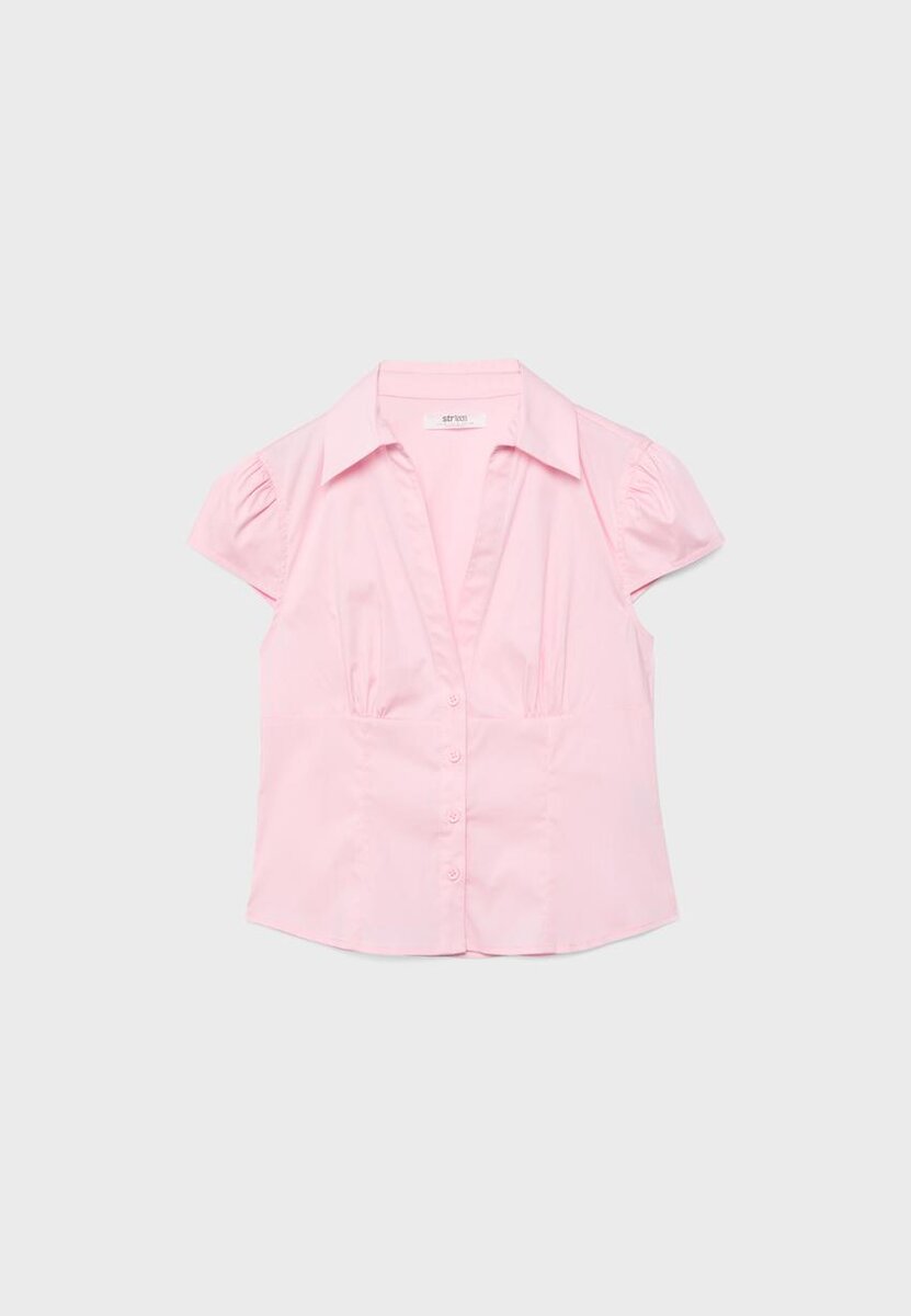 Tettsittende skjorte med reverskrage og V-hals, med korte ermer og knappestolpe foran. Tilgjengelig i ulike farger.