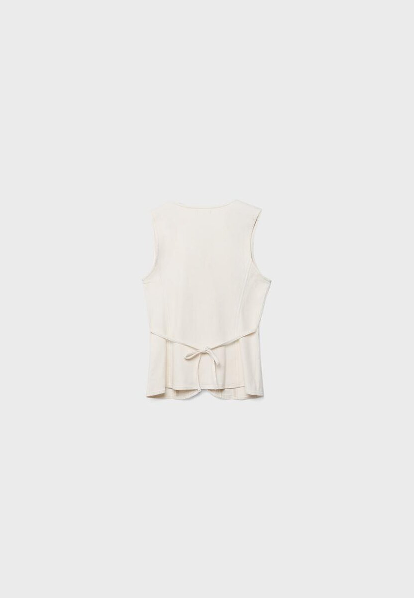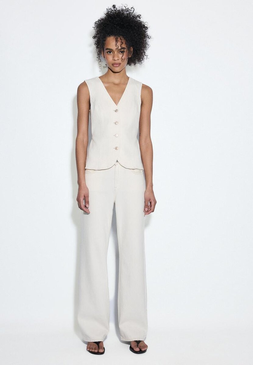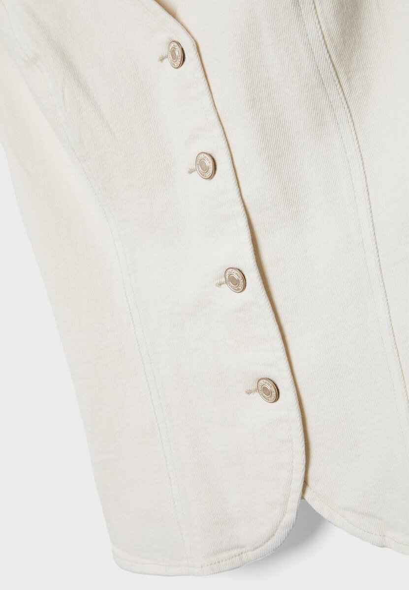 Tettsittende toppe i denim i veststil med V-hals og ermeløs design. Lukking foran med matchende knapper. Tilgjengelig i flere farger.