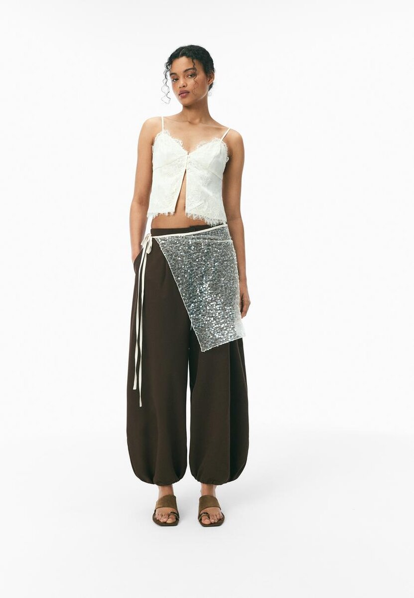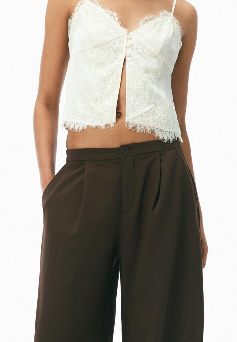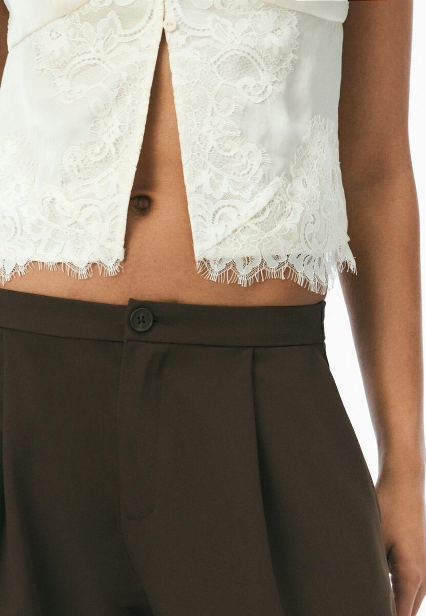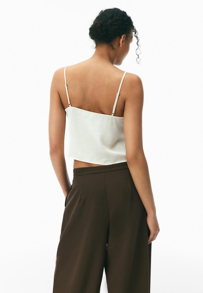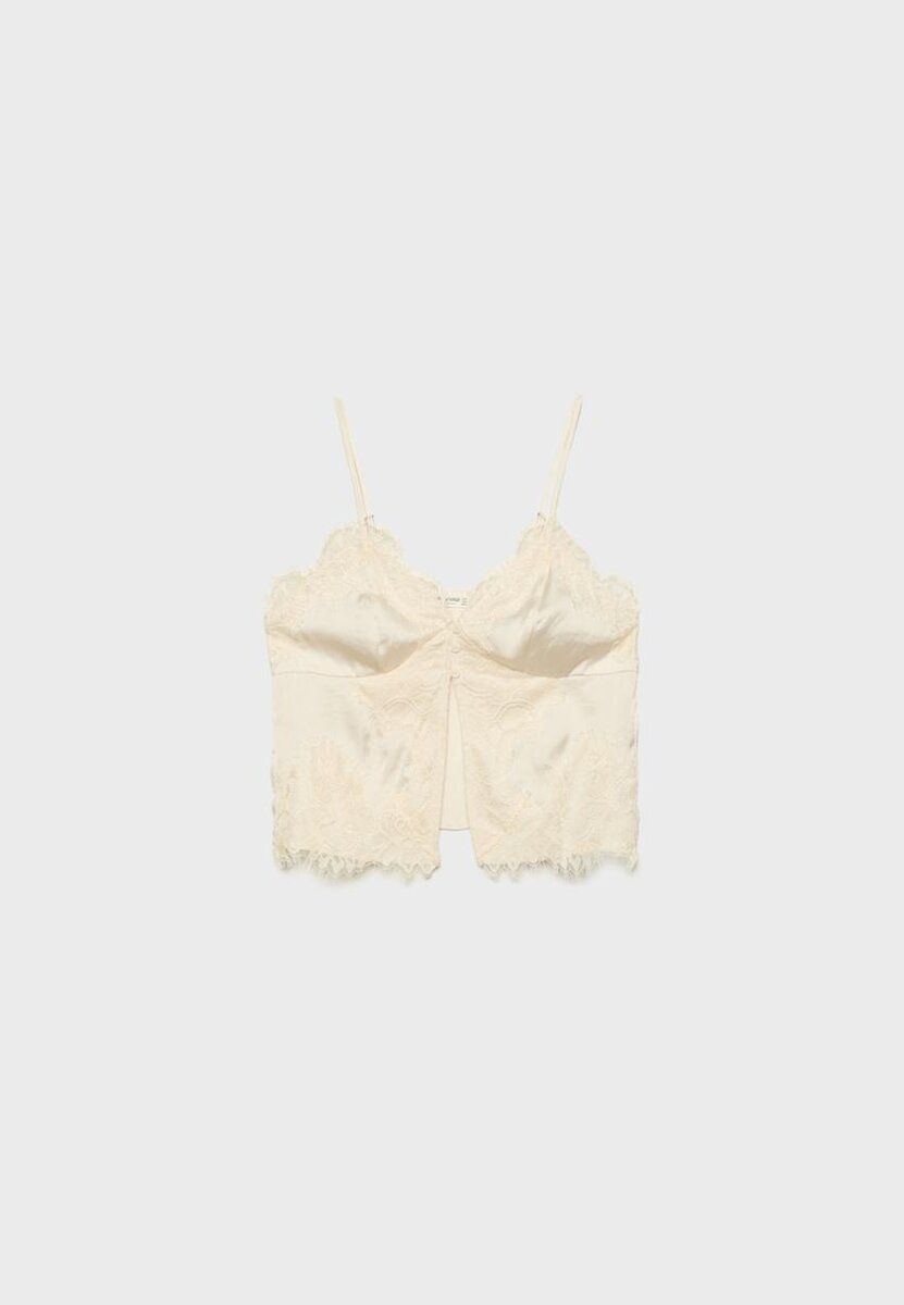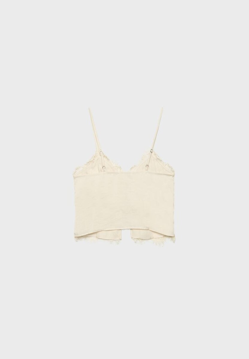 Top laget av stoff med satengeffekt. Med V-hals og tynne stropper. Med blonderapplikasjoner på halsen og nederkant. Split foran. Tilgjengelig i ulike farger.