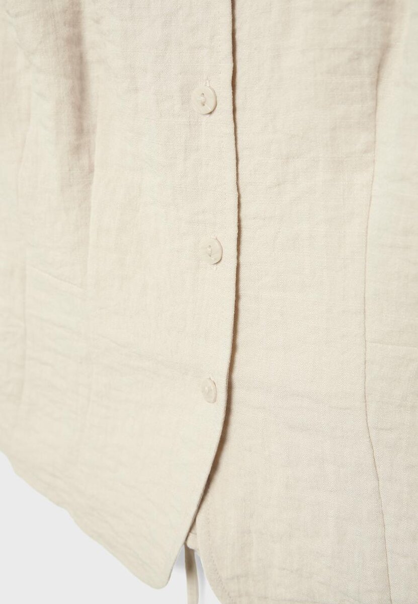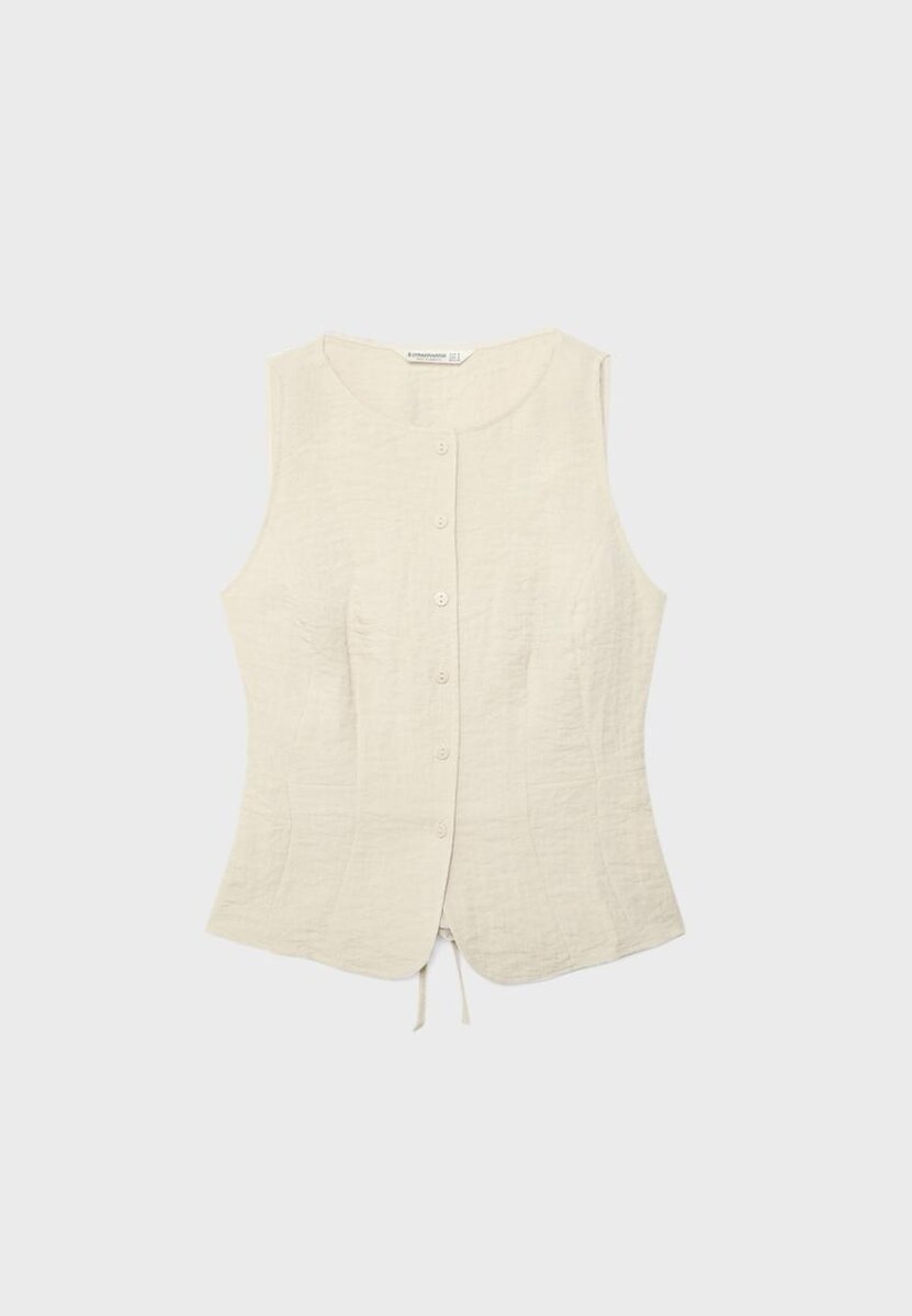 Ermeløs vest med rund hals. Knappestolpe foran og justerbar snøring i ryggen. Tilgjengelig i flere farger.