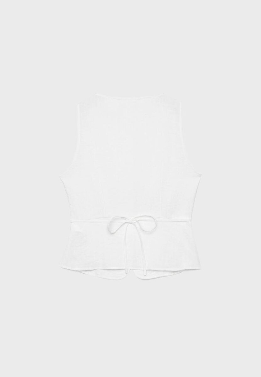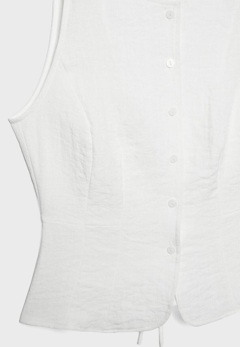 Ermeløs vest med rund hals. Knappestolpe foran og justerbar snøring i midjen bak. Tilgjengelig i flere farger.