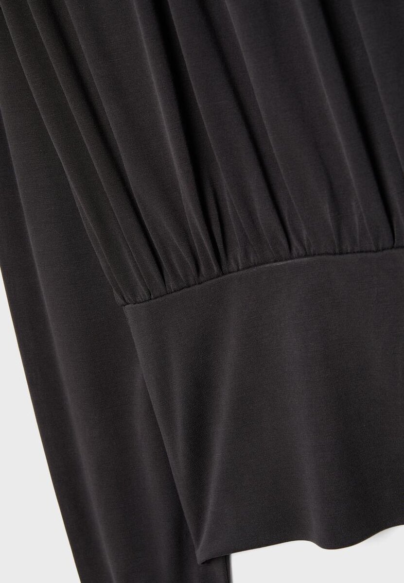 Flytende Soft-Touch T-skjorte med asymmetrisk halsutringning og lange ermer med mansjetter. Med rynket detalj på den øvre delen og en tettsittende kant.
