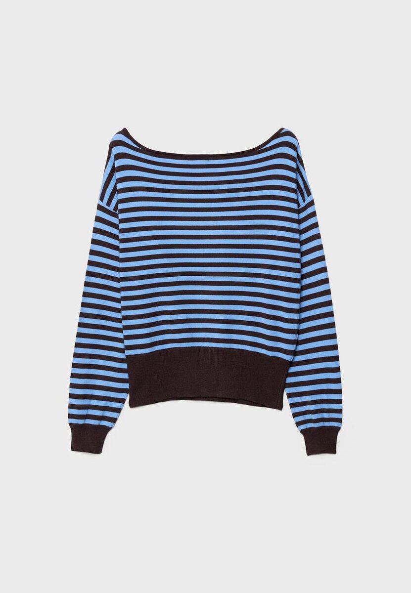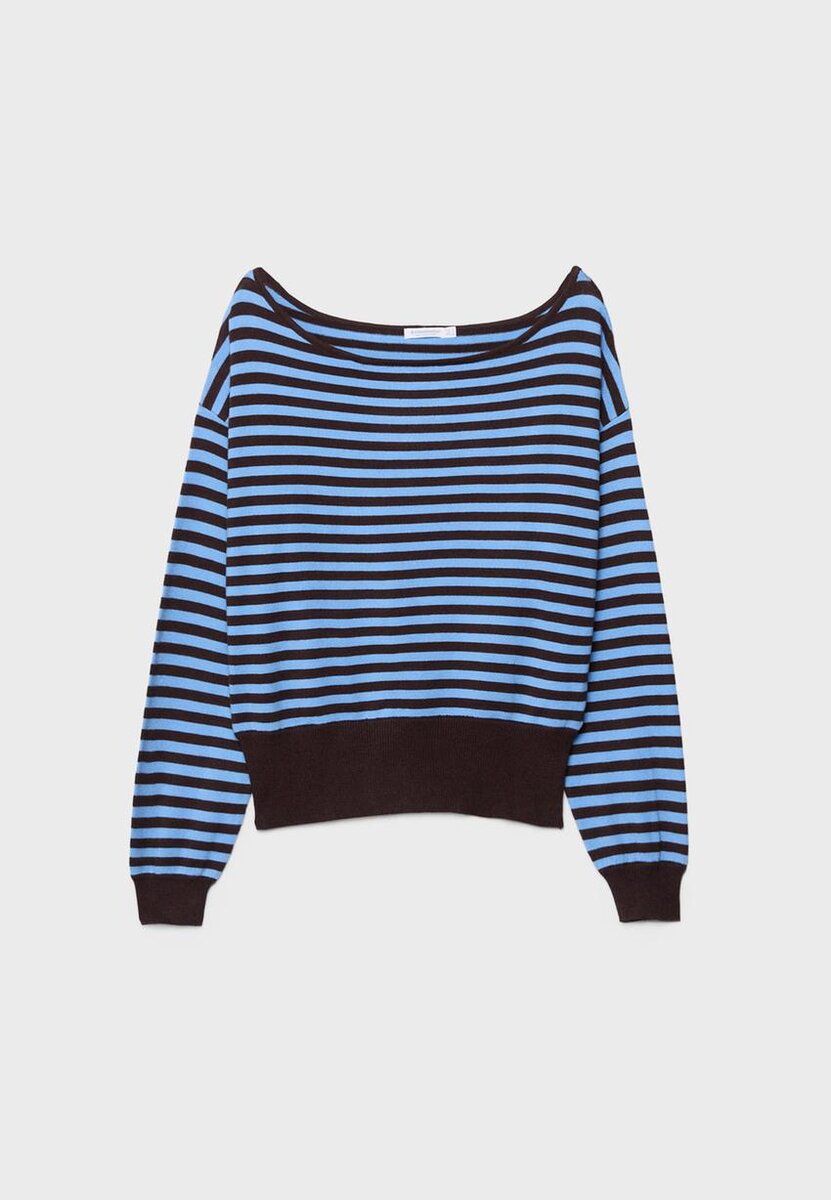 Strikket genser med stretch. Har båthals og lange ermer med mansjetter. Ribbet kant. Tilgjengelig i ulike farger.