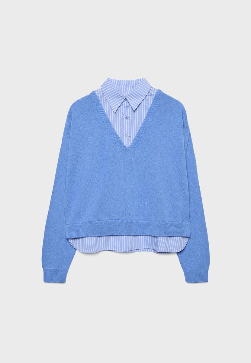 Strikkegenser med V-hals og krage i skjortestil. Langermet. Nedkant i kombinert stoff med et dobbeltlags overleggseffekt. Ribbestrikkede kanter.
