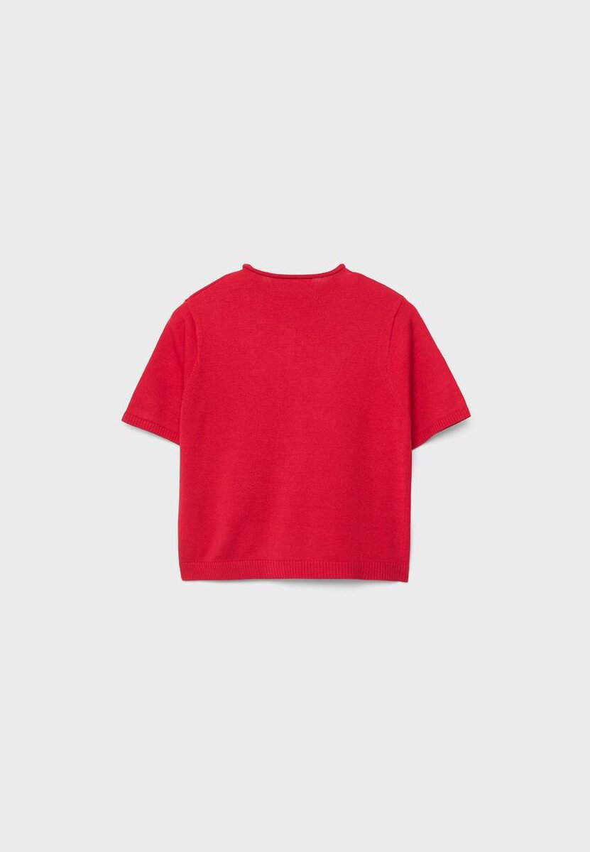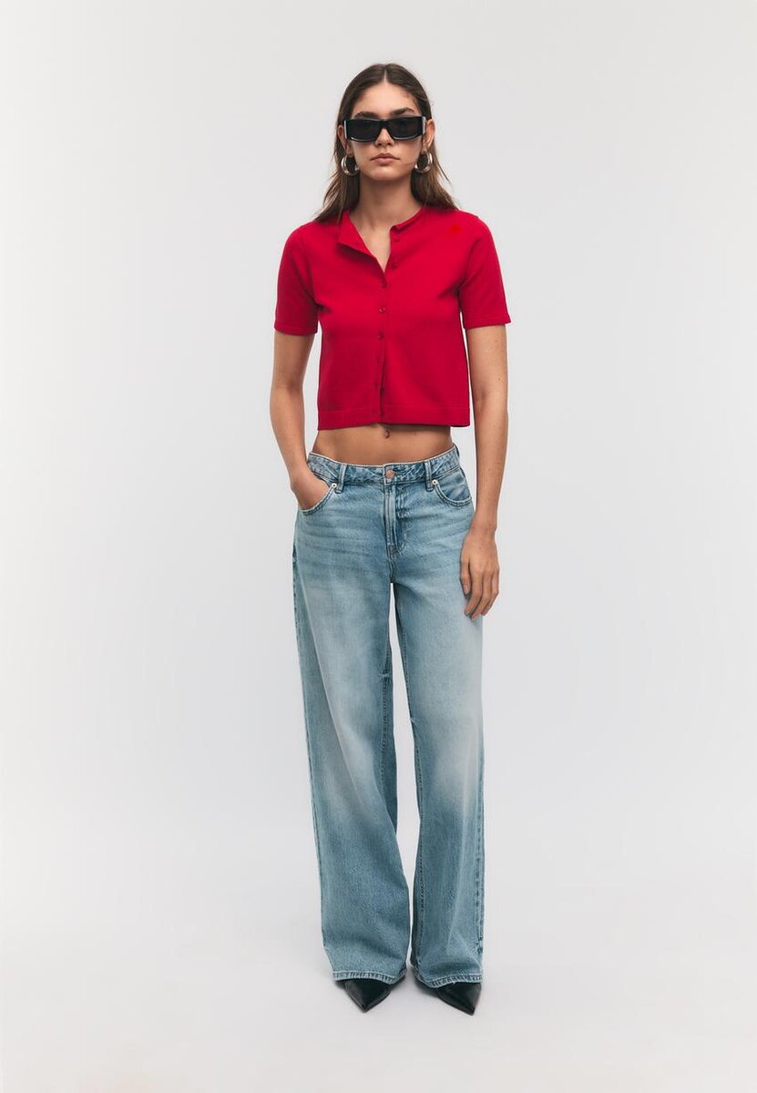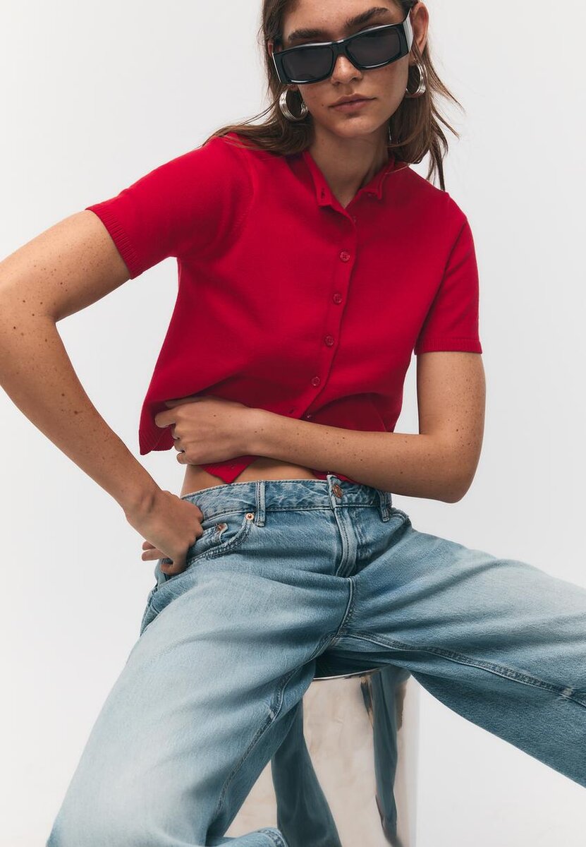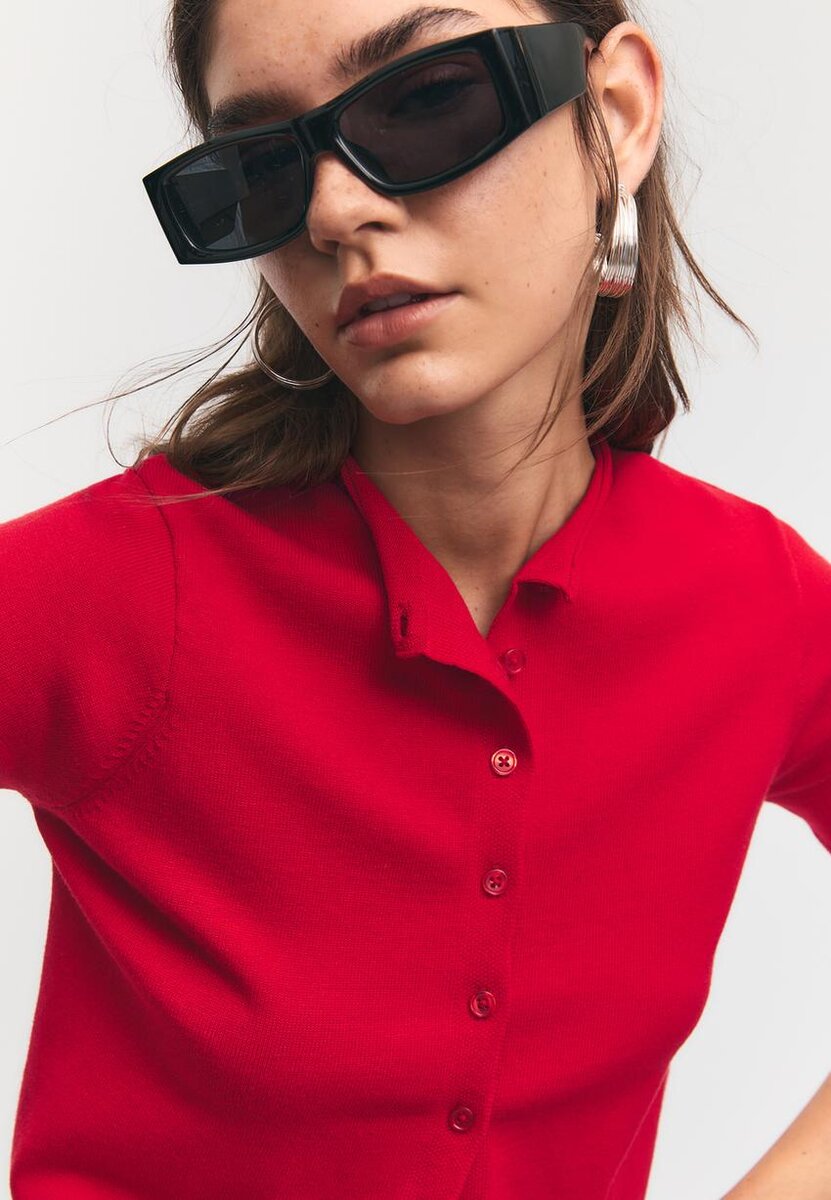 Strikkegenser med stående krage og korte ermer. Lukking foran med matchende knapper. Ribbestrikk på ermene og nederst. Tilgjengelig i flere farger.