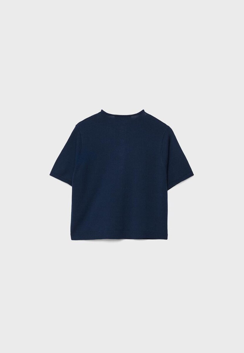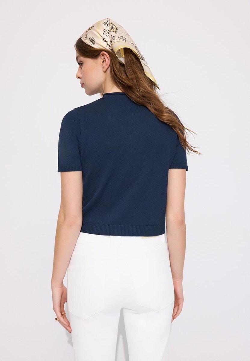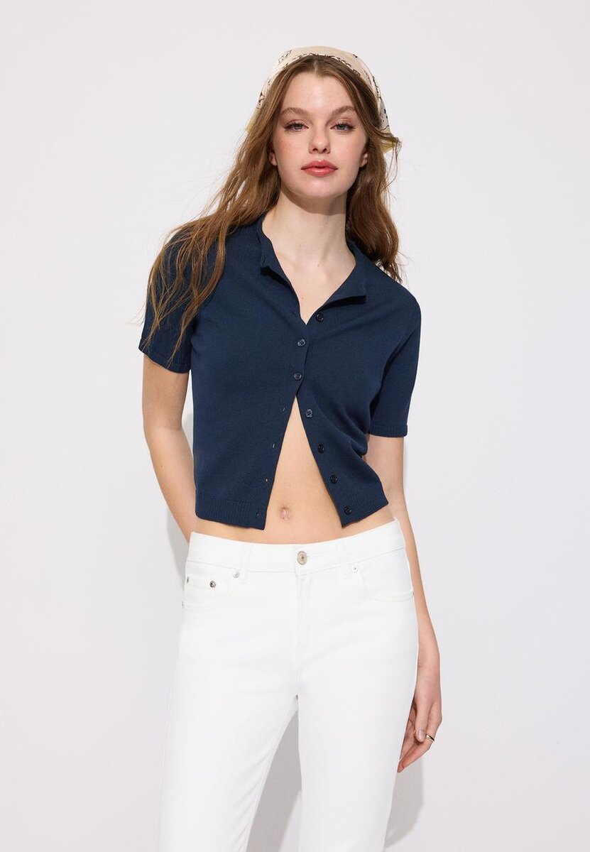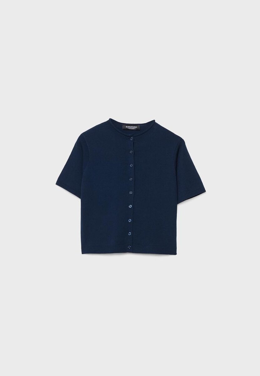 Strikket cardigan med stående krage og korte ermer. Lukking foran med matchende knapper. Ribbestrikkede detaljer på ermer og nederkant.