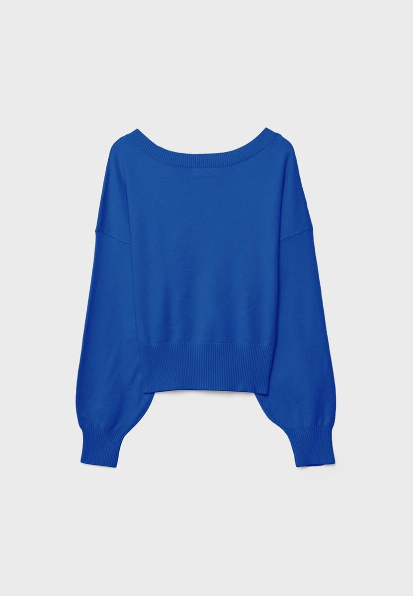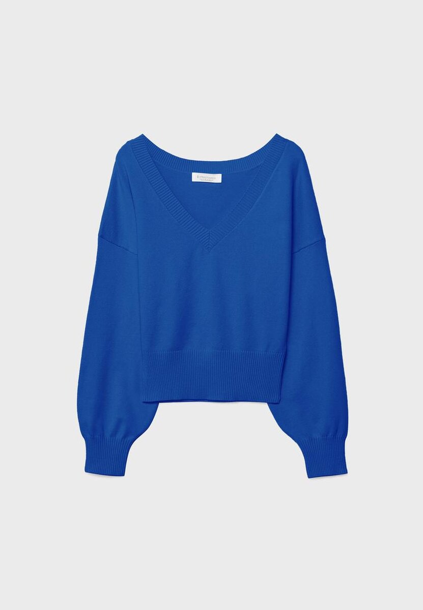 Strikket genser med V-hals og flaggermusermer. Ribbet kant. Tilgjengelig i flere farger.