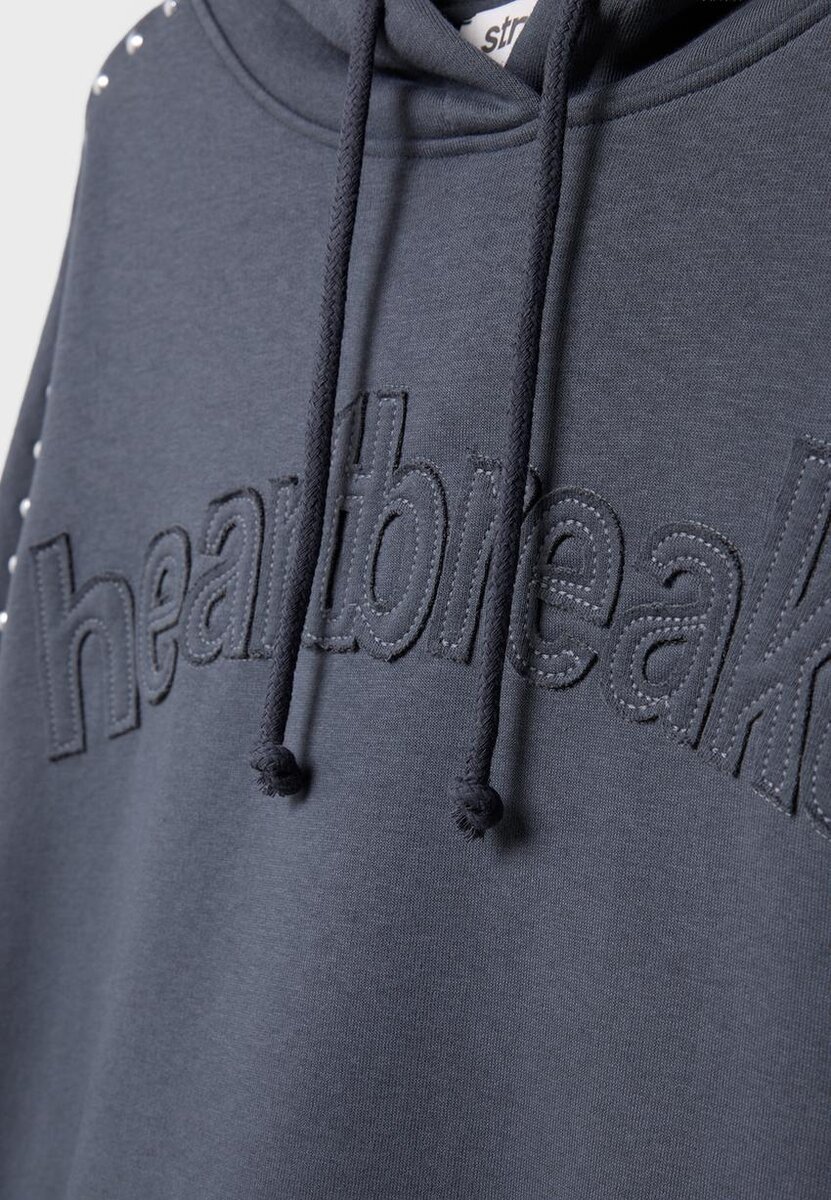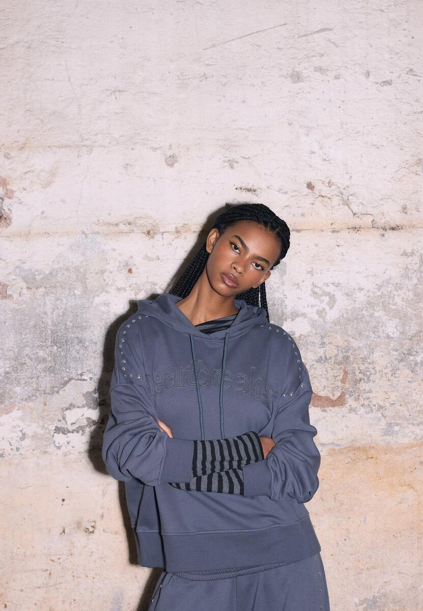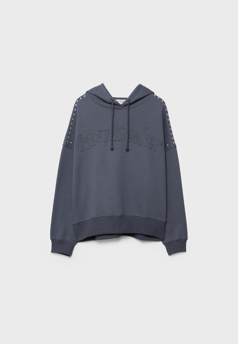 Hettegenser med justerbar hette med snøring. Lange ermer. Ribbestrikkede kanter. Nittedetaljer på skulderen og broderi foran.