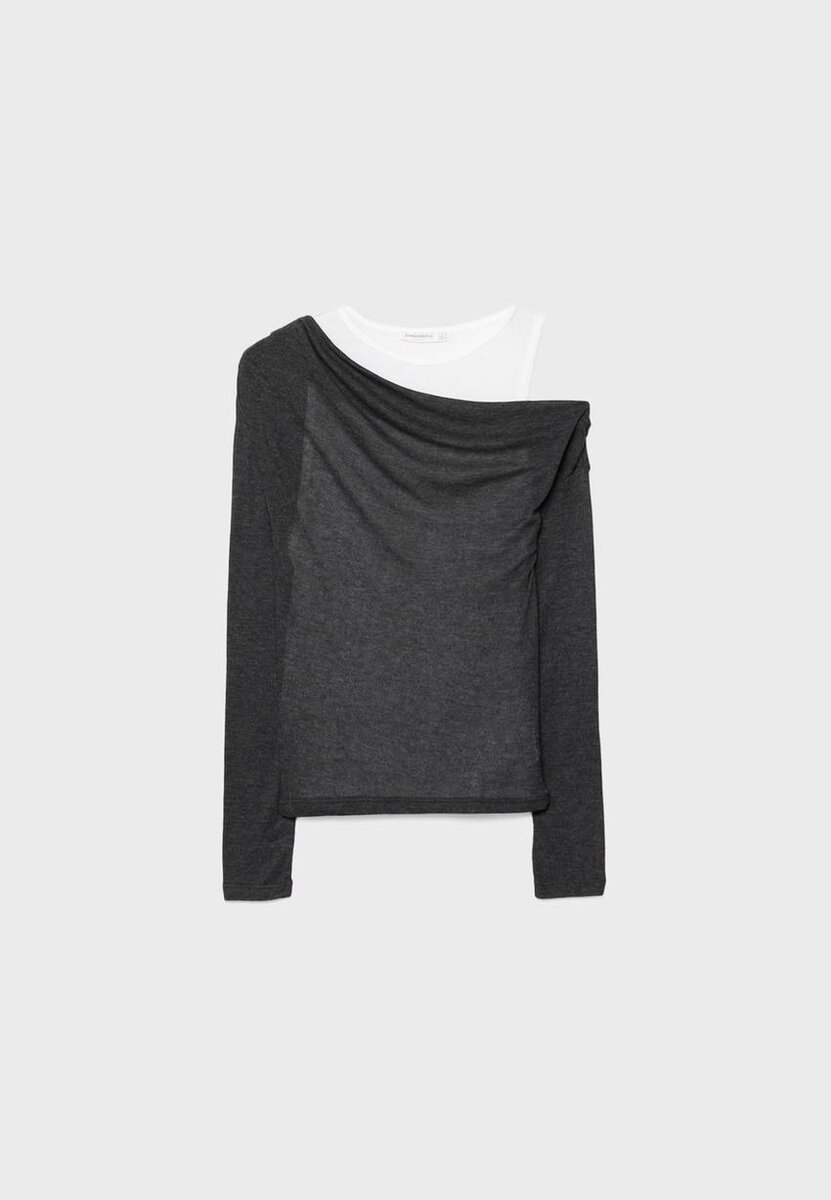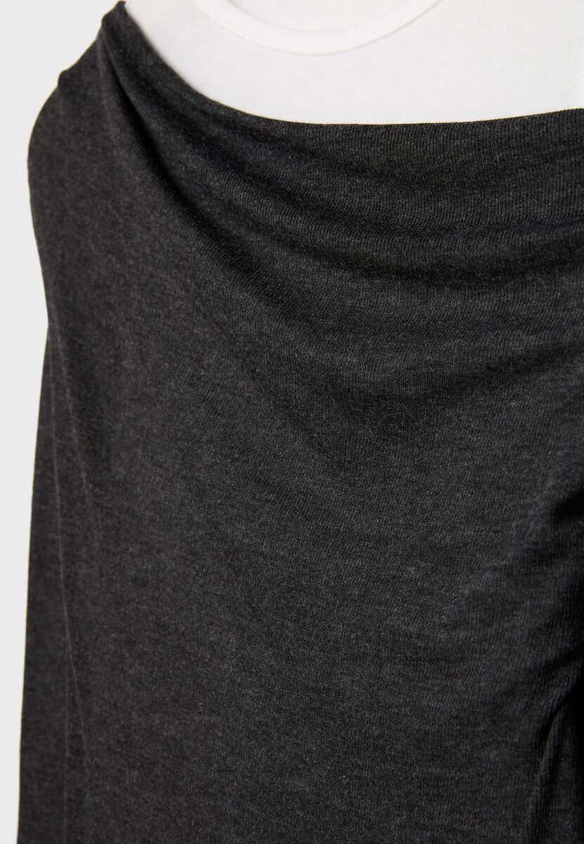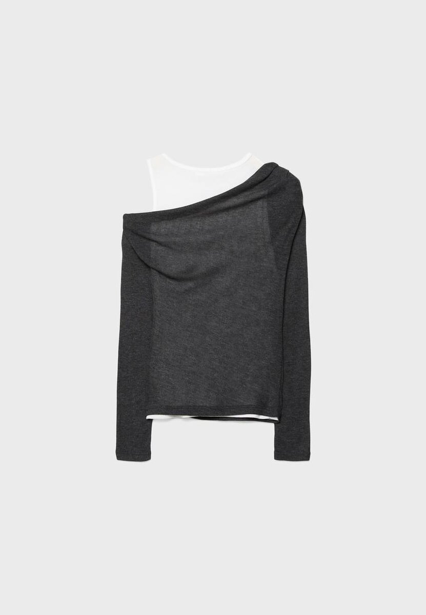 Kombinert T-skjorte med asymmetrisk drapert hals og lange ermer. Med en kontrastfarget T-skjorte med rund hals og racerback-stropper på innsiden. Tilgjengelig i flere farger.