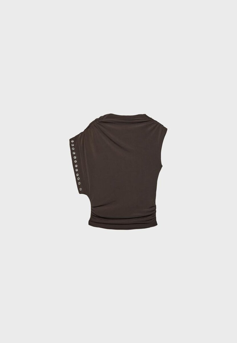 Asymmetrisk topp uten ermer med rund hals. Tettsittende kant. Nitte-detaljer.