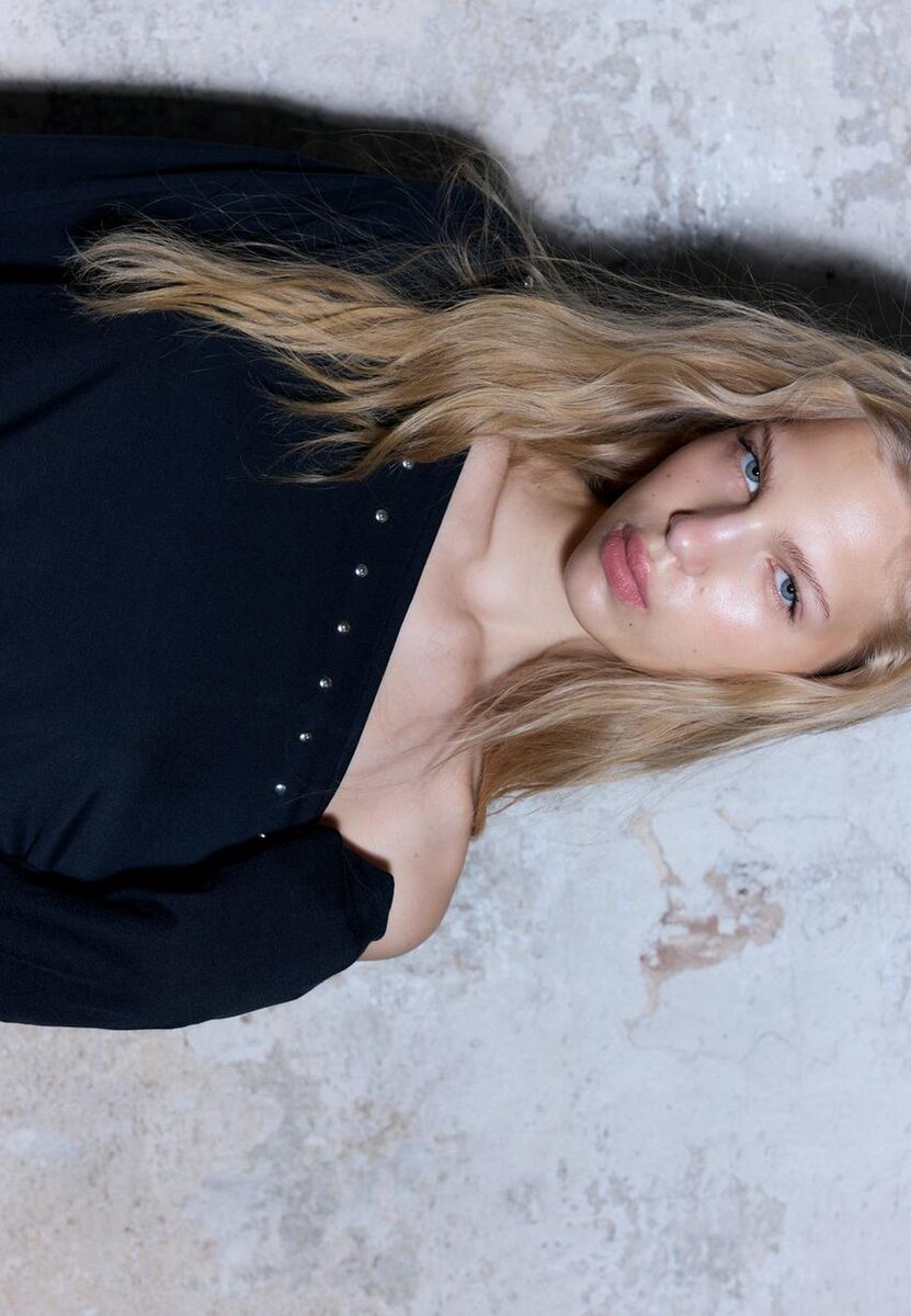 Asymmetrisk snitt, langermet T-skjorte med bar skulder. Nitte-detaljer. Tilgjengelig i flere farger.