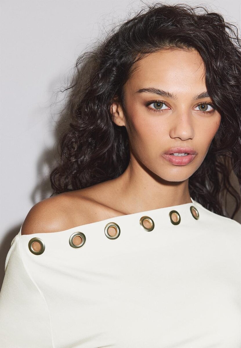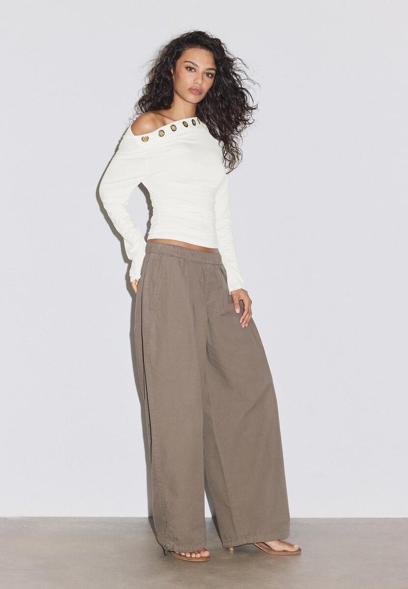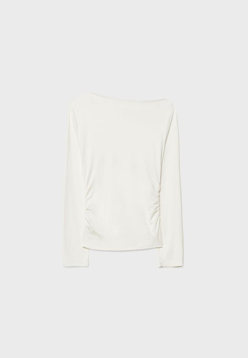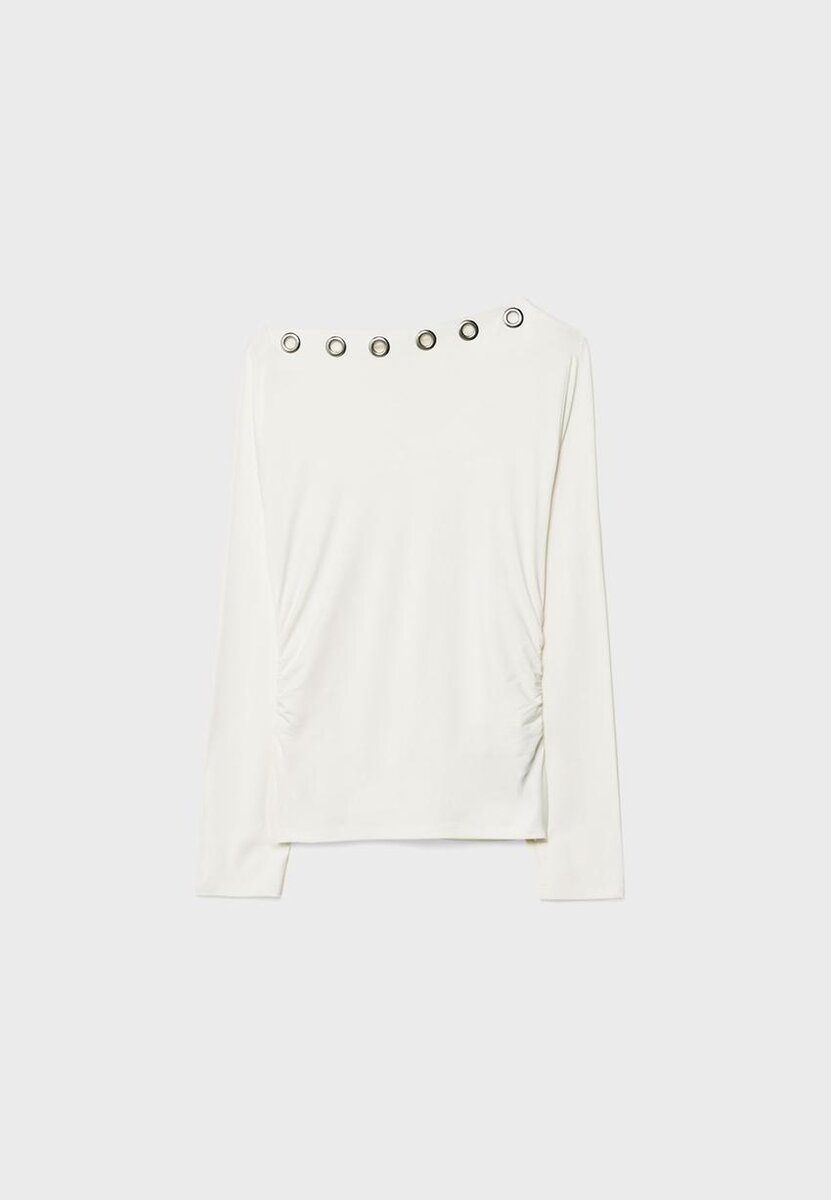 Tettsittende T-skjorte med asymmetrisk halsutringning og lange ermer med én bar skulder. Metalløyer foran og rynket stoff på sidene. Tilgjengelig i flere farger.