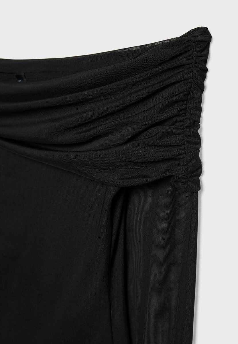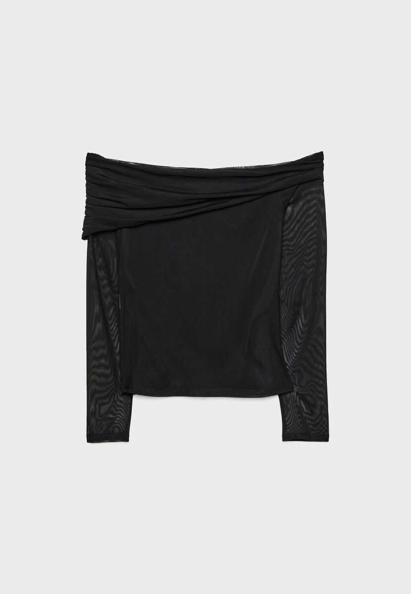 T-skjorte laget av halvtransparent tyllstoff med innerfôr. Med rett halsutringning med asymmetrisk oppbrett og lange ermer med utskjæringer på skuldrene. Rynket stoffdetalj på siden. Tilgjengelig i flere farger.