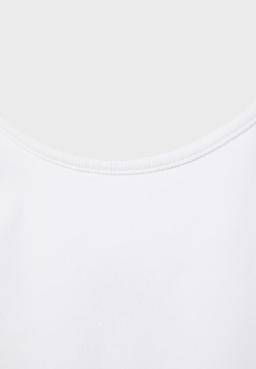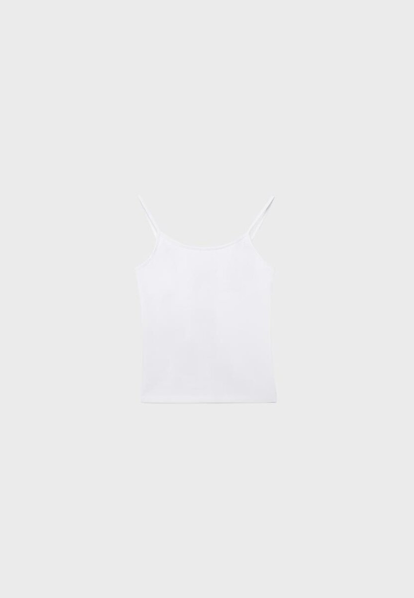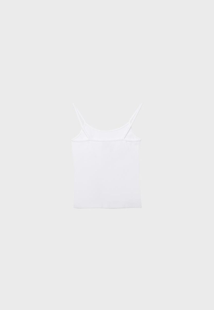 Topp i bomullsblanding. Tettsittende snitt. Rund hals og stropper. Ribbestrikkede detaljer. Tilgjengelig i ulike farger.