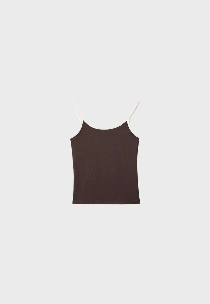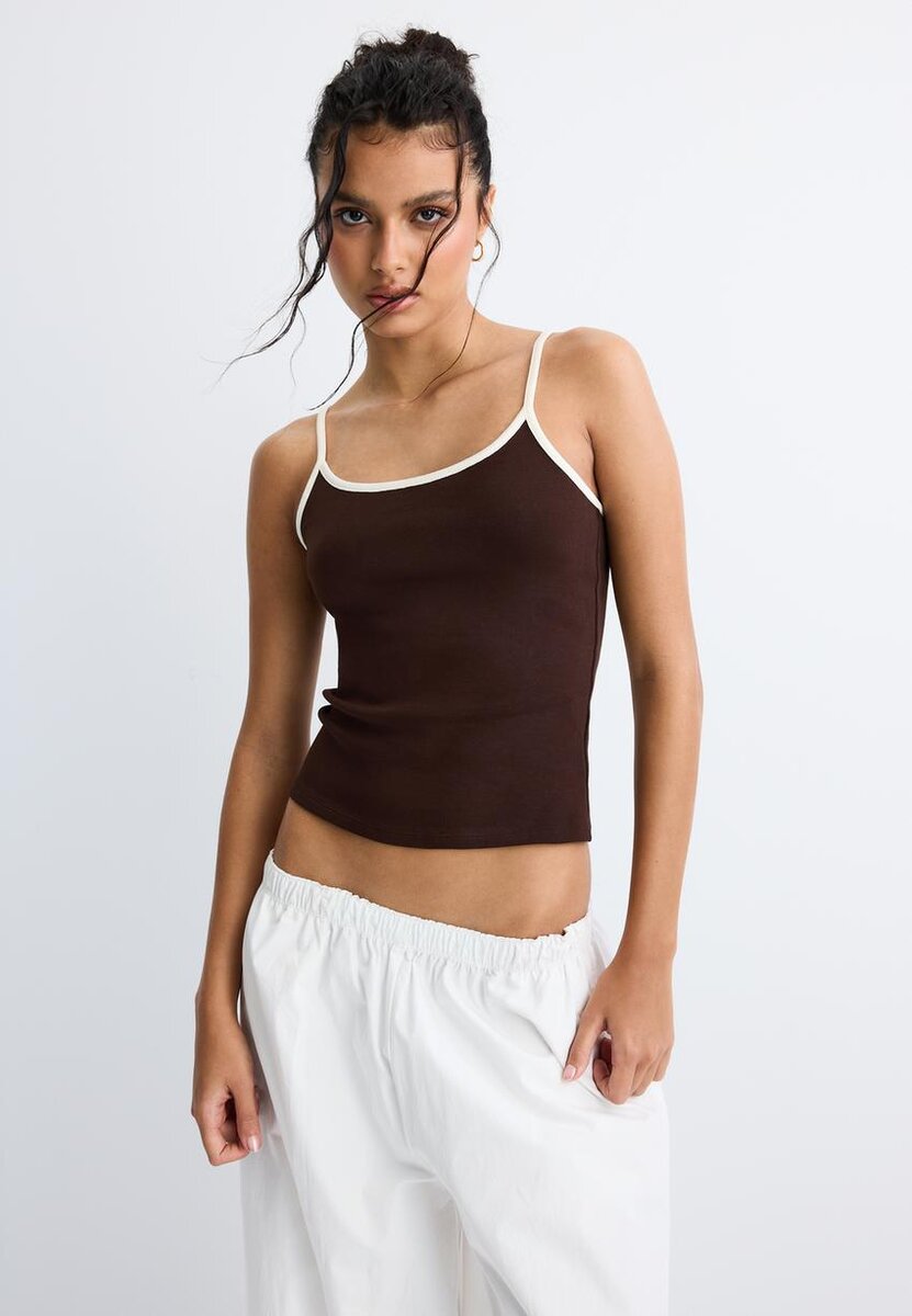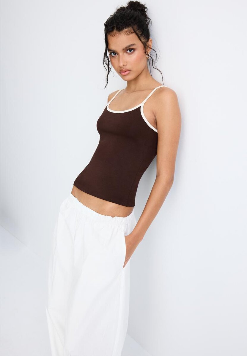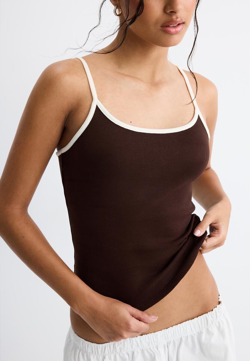 Topp i bomullsblanding. Tettsittende snitt. Rund hals og stropper. Ribbestrikkede detaljer. Tilgjengelig i flere farger.