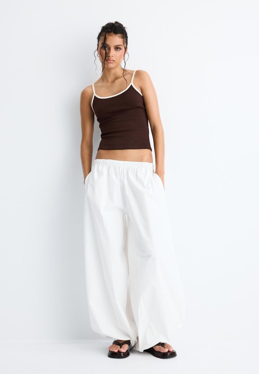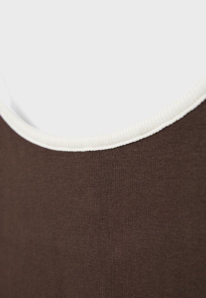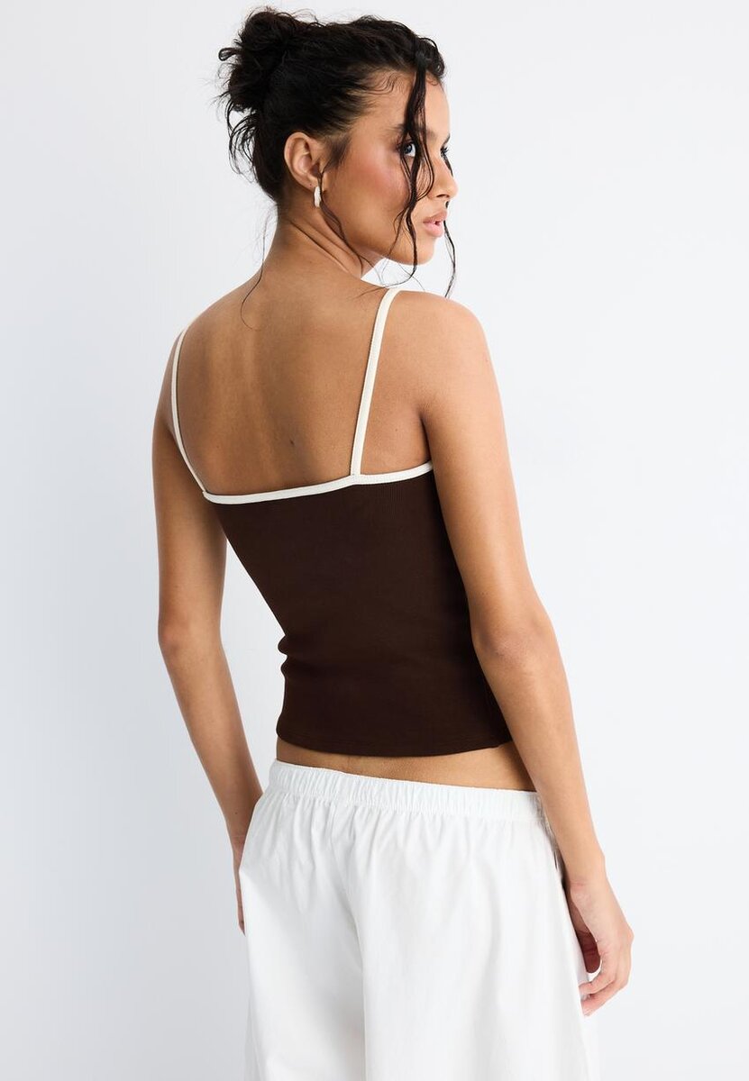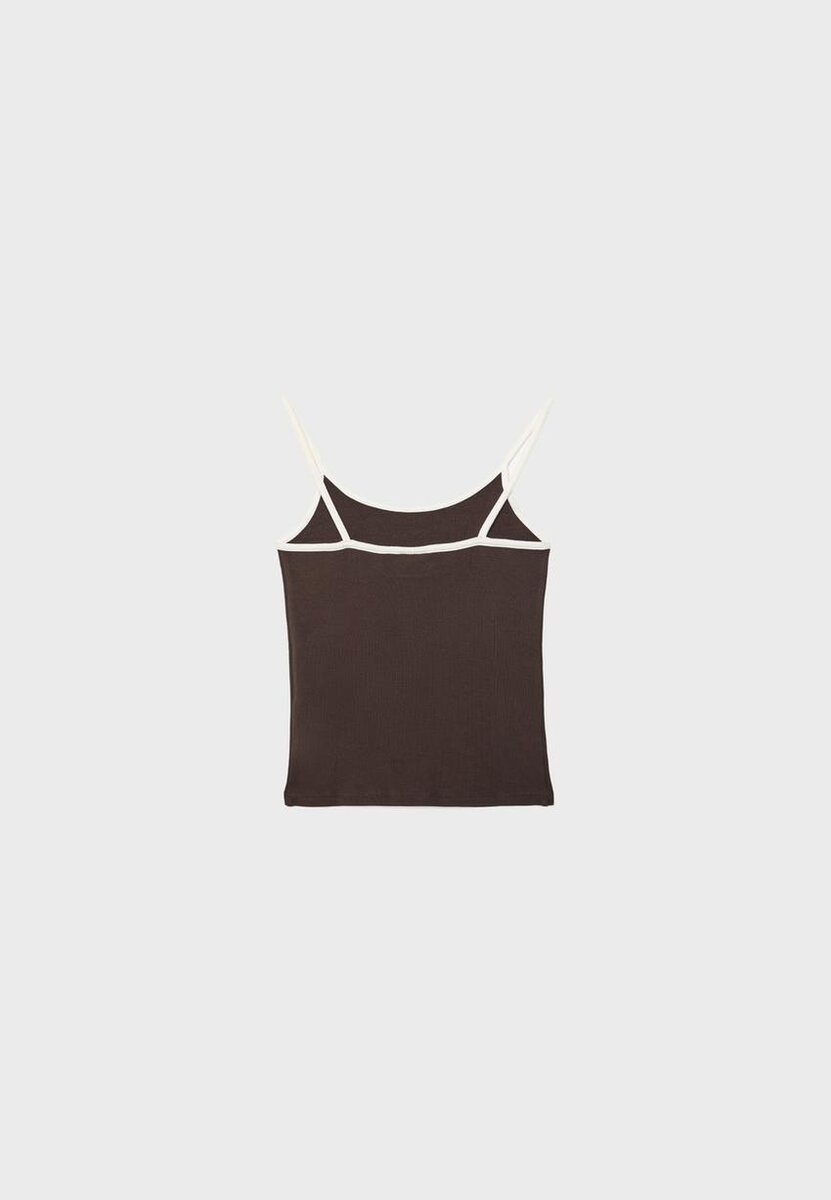 Topp i bomullsblanding. Tettsittende snitt. Rund hals og stropper. Ribbestrikkede detaljer. Tilgjengelig i flere farger.