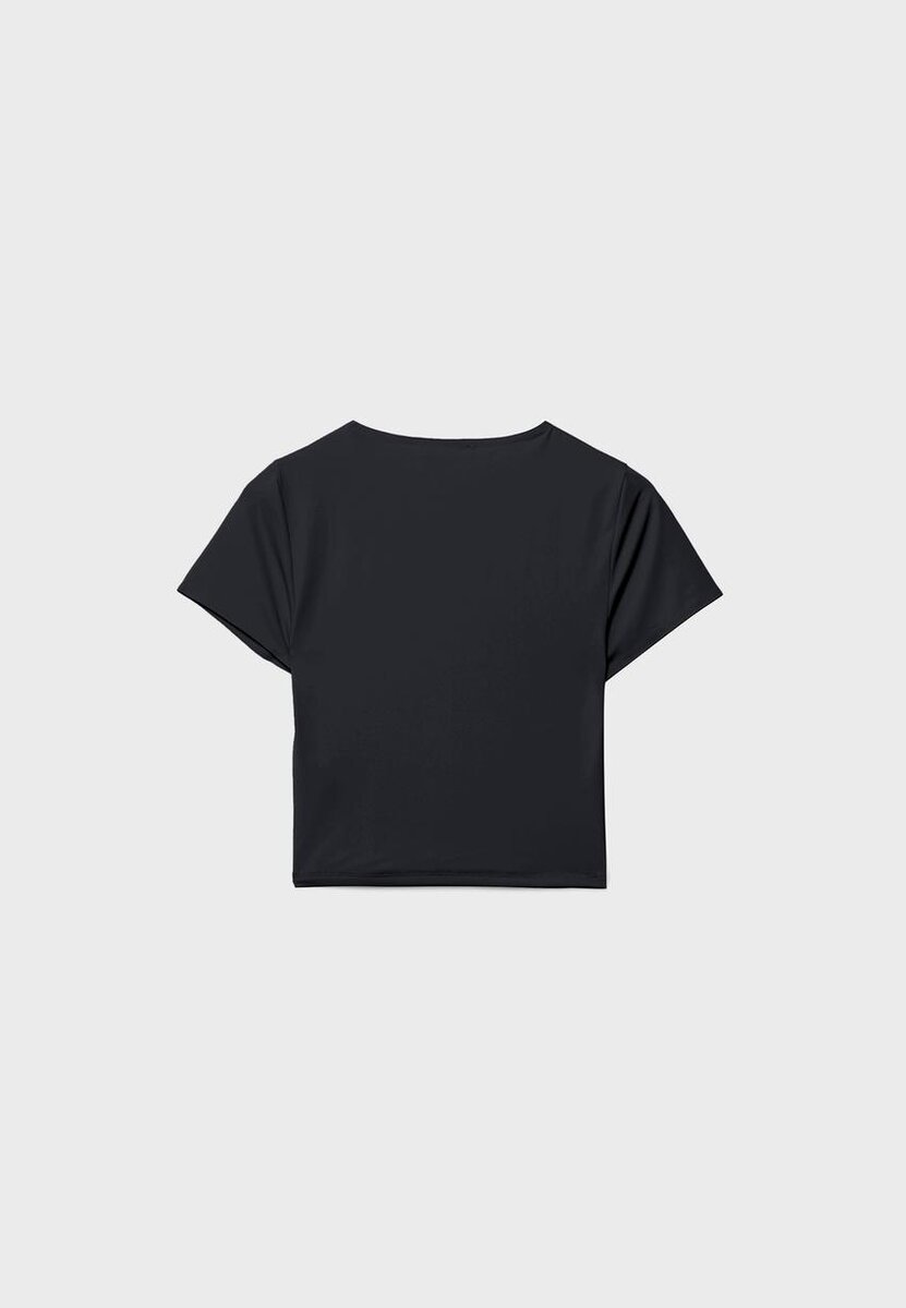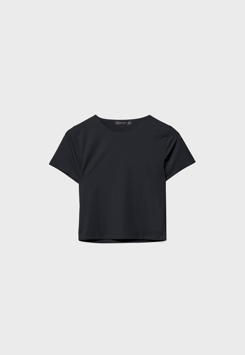Tettsittende, kort T-skjorte laget av en polyamidblanding. Rund hals og korte ermer.