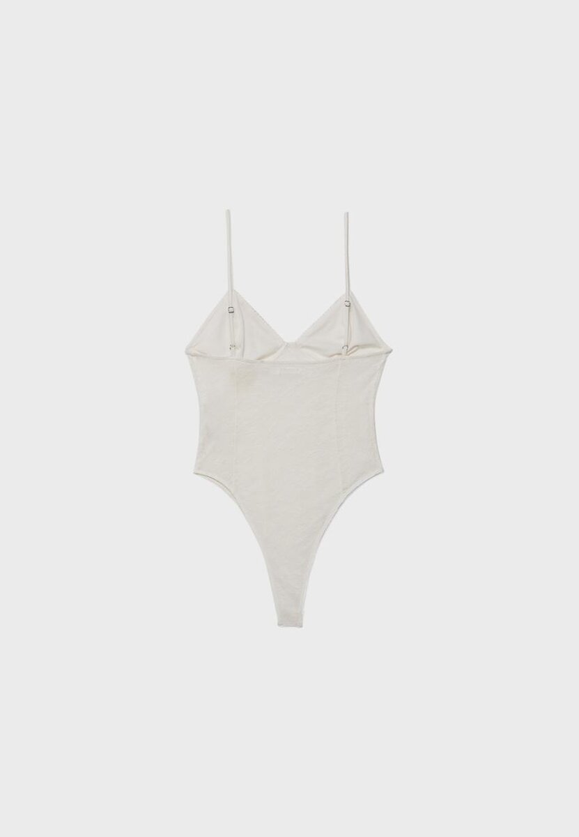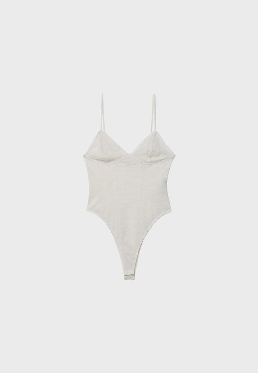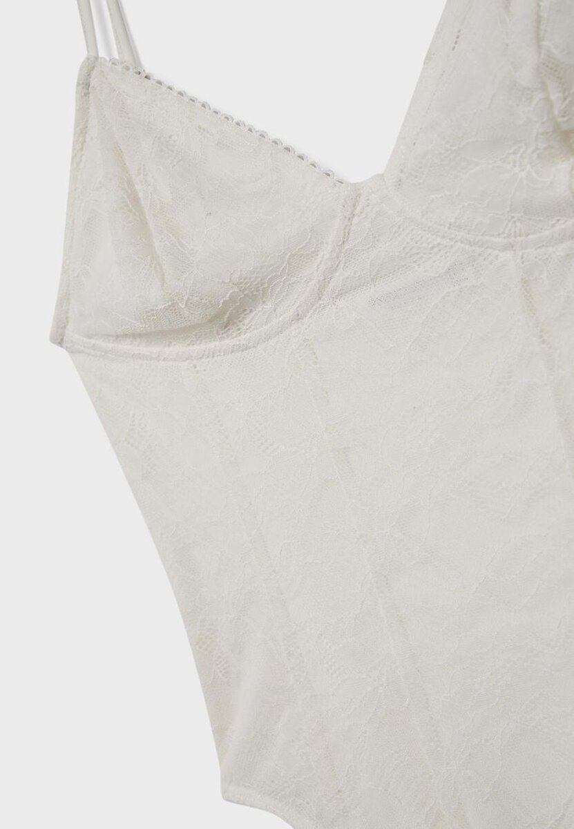 Body laget av elastisk blonderstoff. Hjerteformet utringning med tynne stropper og brystkopper. Matchende innerfôr. Trykknappfeste nederst. Tilgjengelig i en rekke farger.