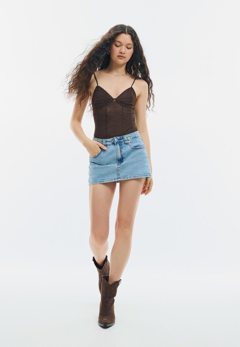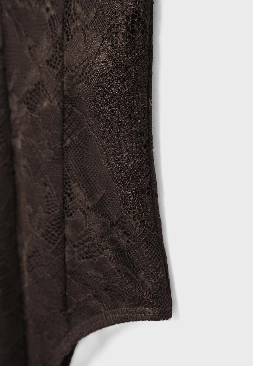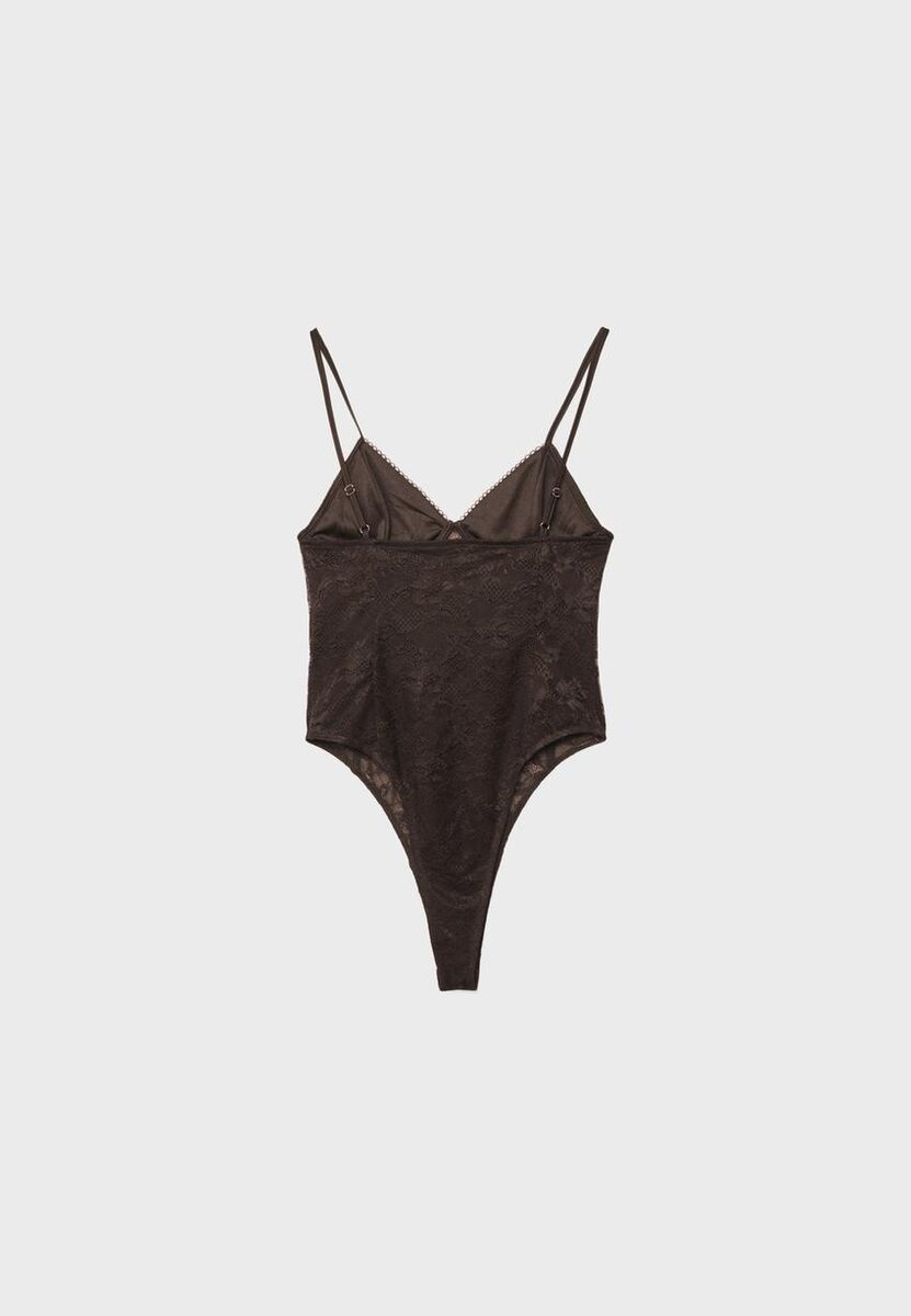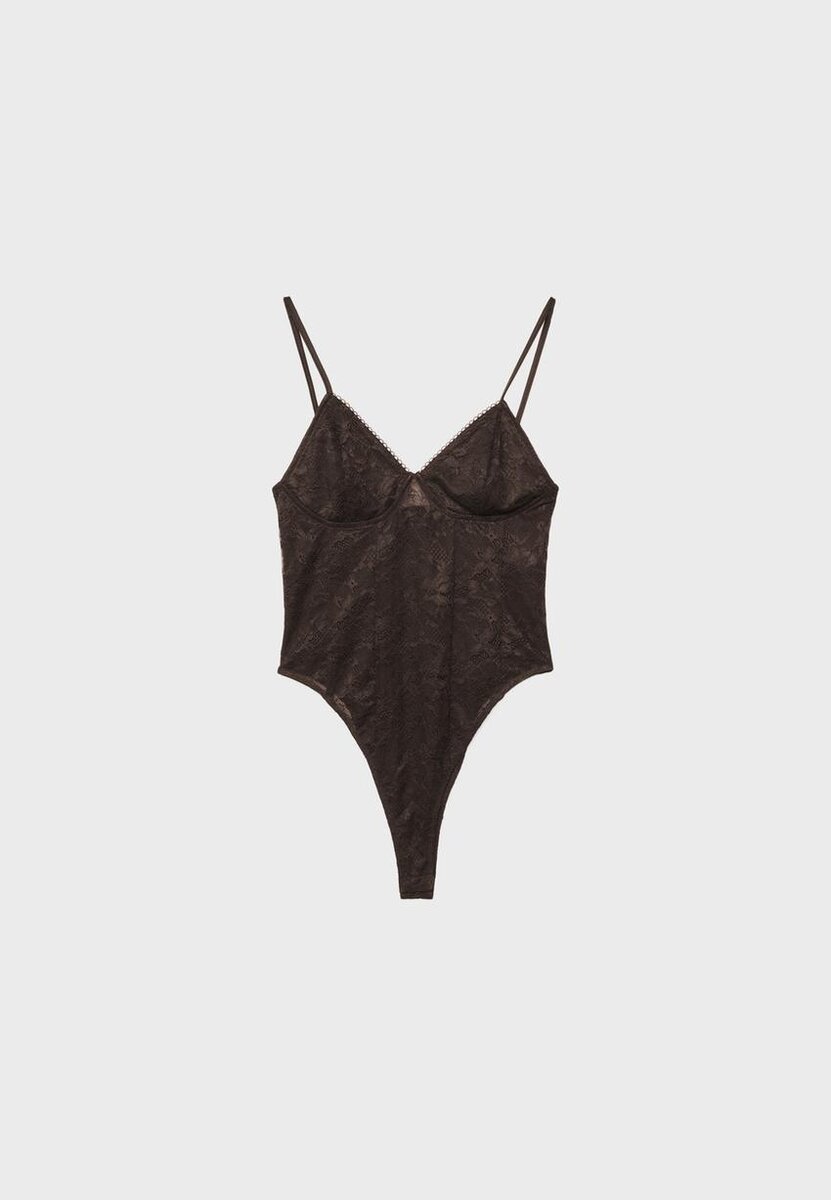 Bodysuit laget av elastisk blondestoff. Hjerteformet utringning med tynne stropper og brystkåper. Matchende innerfôr. Trykknapp-lukking nederst. Tilgjengelig i flere farger.