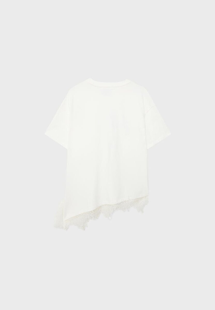 T-skjorte med rund hals og korte ermer. Asymmetrisk kant med kontraststoff. Trykkdetalj foran.