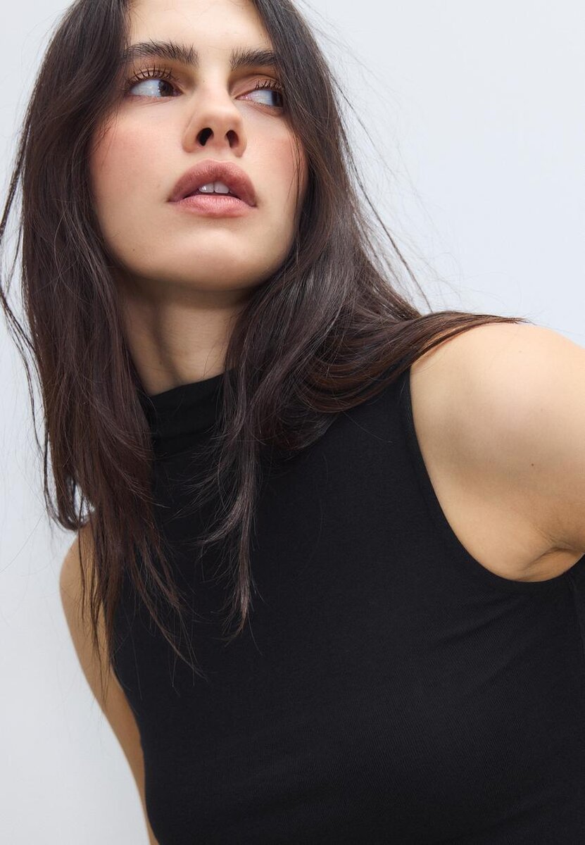 Tettsittende T-skjorte med tragtkrage og ermeløs design. Tilgjengelig i flere farger.