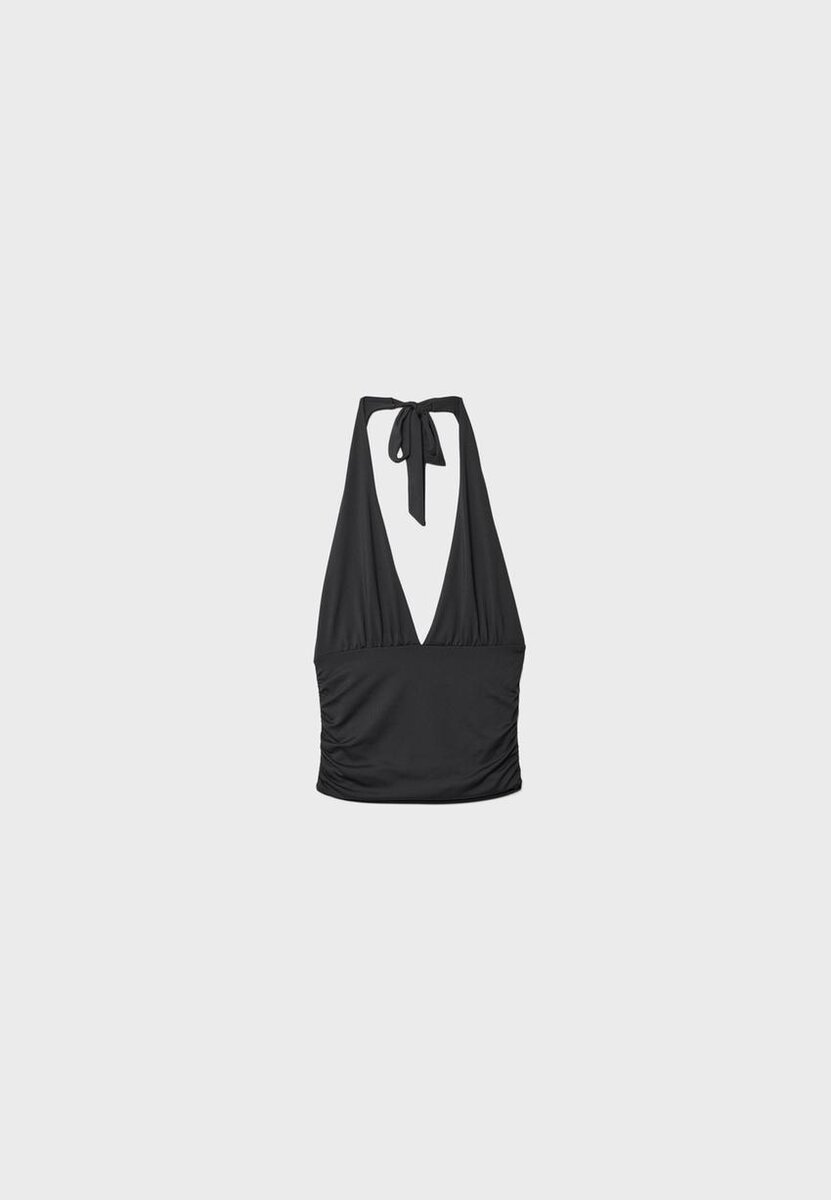 Halter-top med V-hals. Festes i nakken med et bånd. Rynket detalj på siden. Tilgjengelig i flere farger.