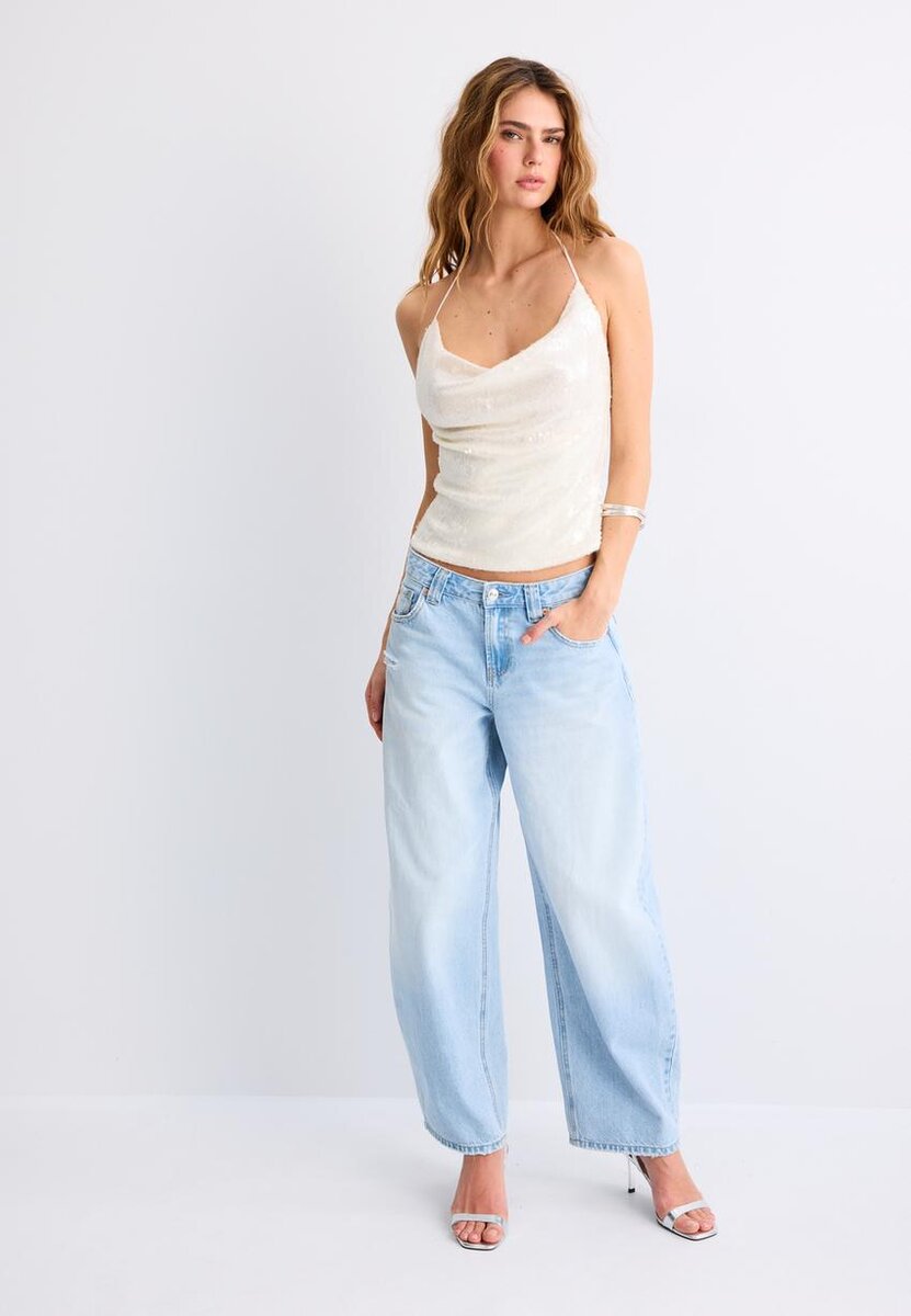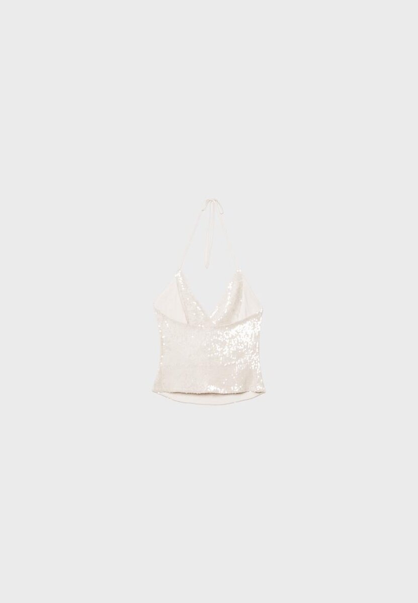 Justerbar halterneck-top med båndlukking i nakken. Åpen rygg. Med paljettstoff. Tilgjengelig i flere farger.