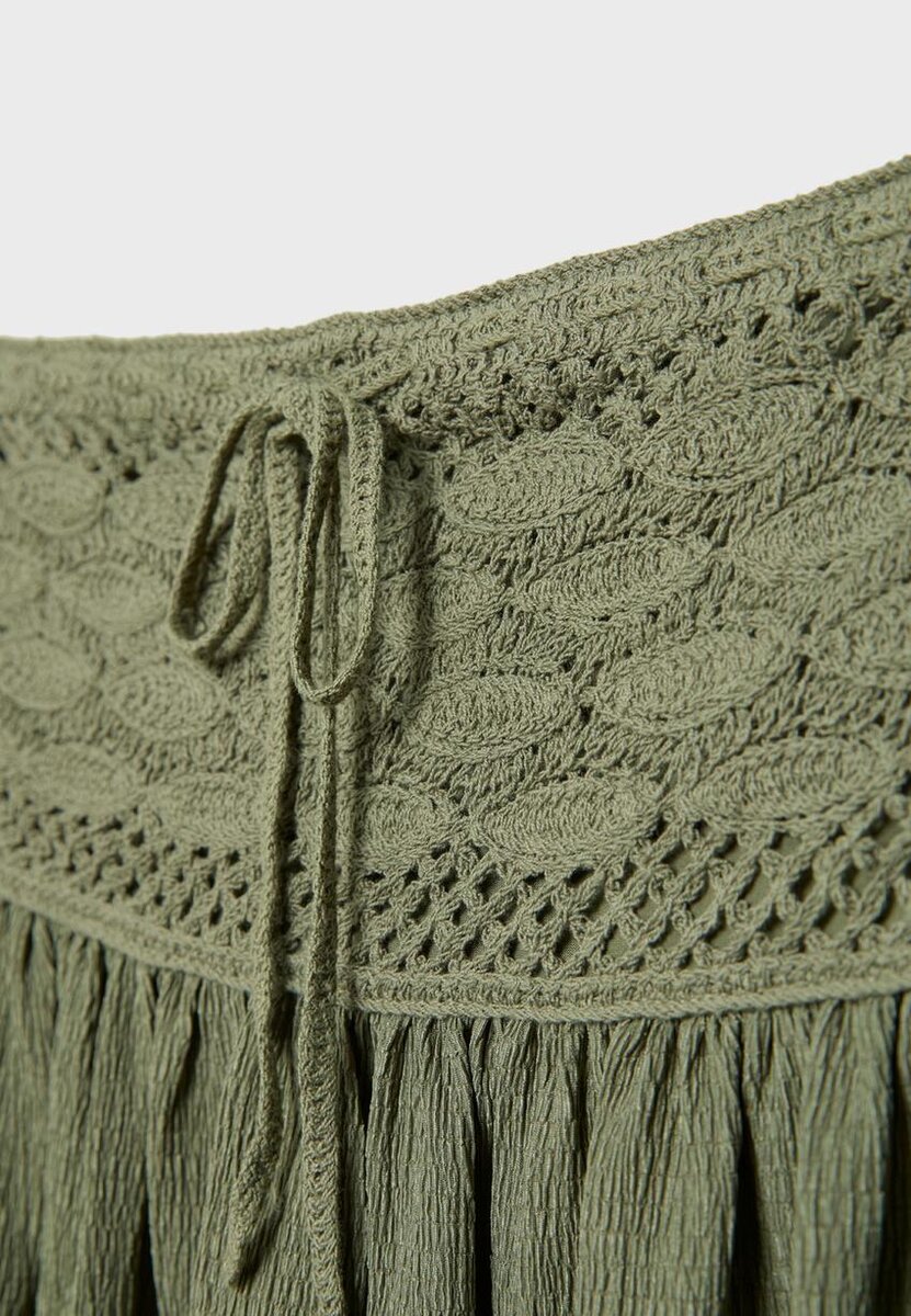 Velløpende bandeau-top med smocket, elastisk rygg. Med heklet detalj og bånd foran. Tilgjengelig i flere farger.