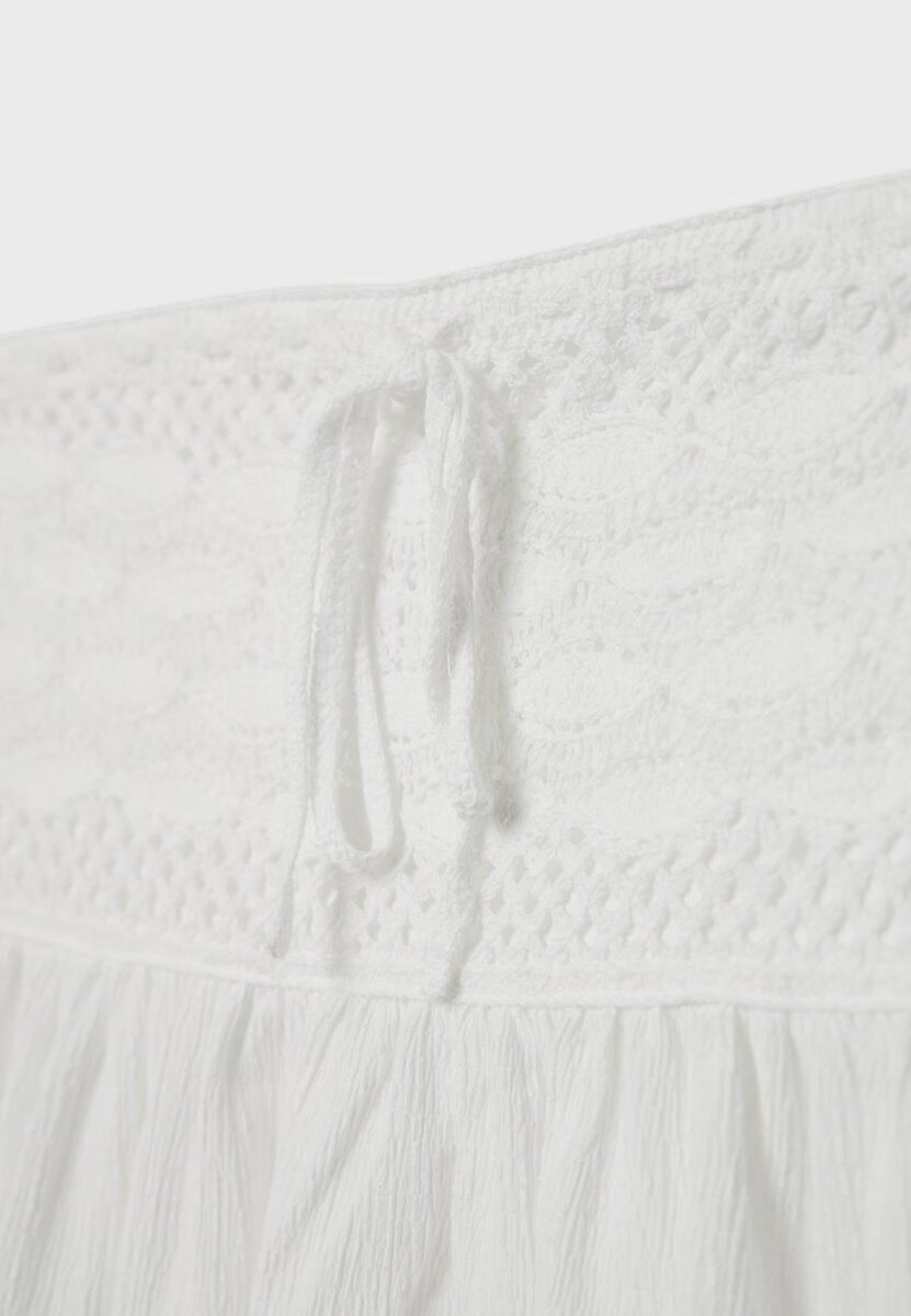 Top med flytende bandeau-utringning. Elastisk smocket rygg. Med heklede detaljer og bånd foran. Tilgjengelig i flere farger.