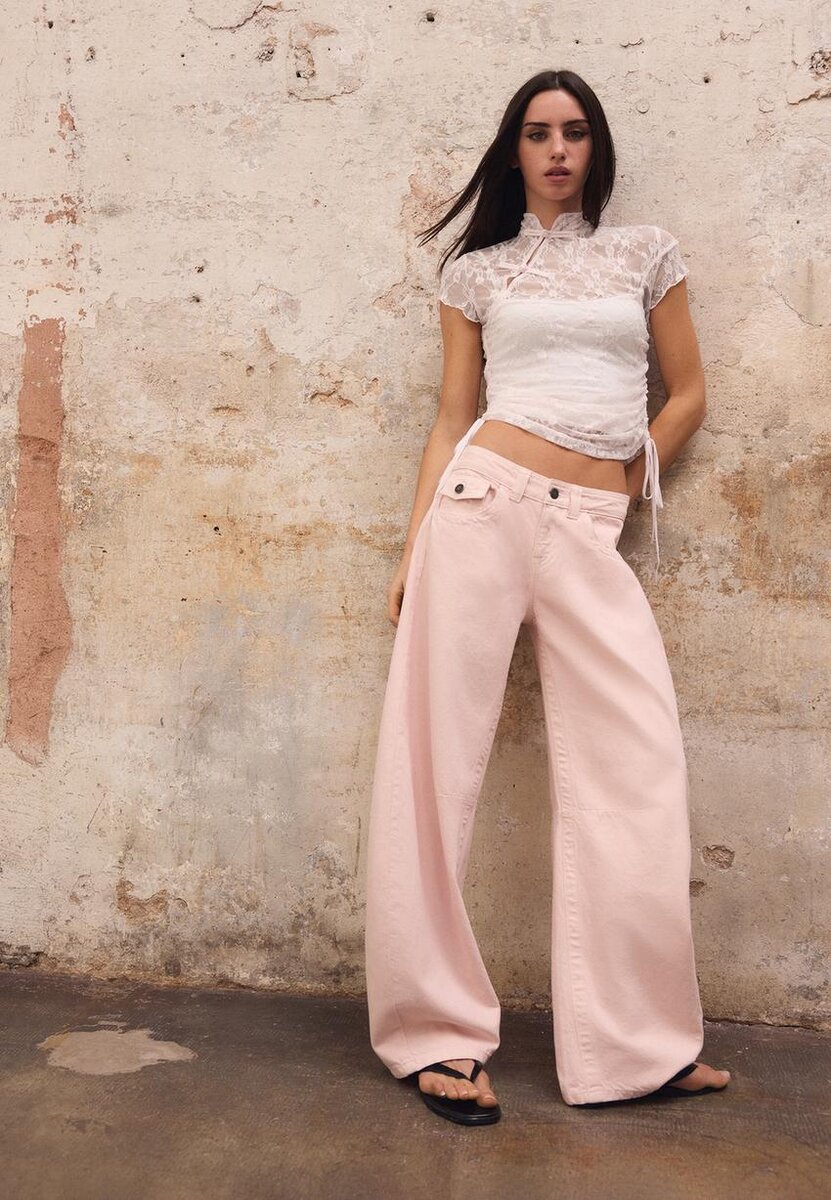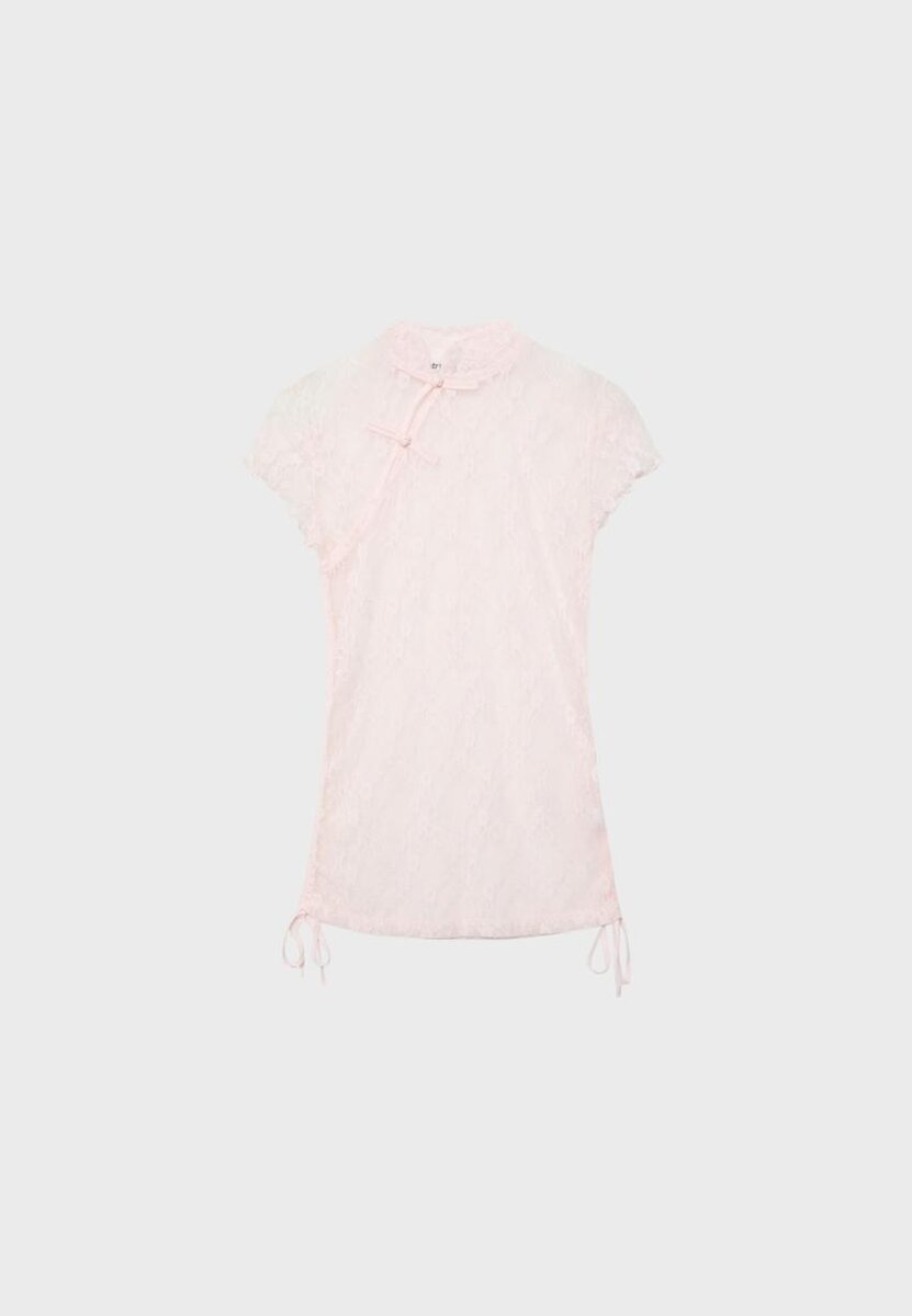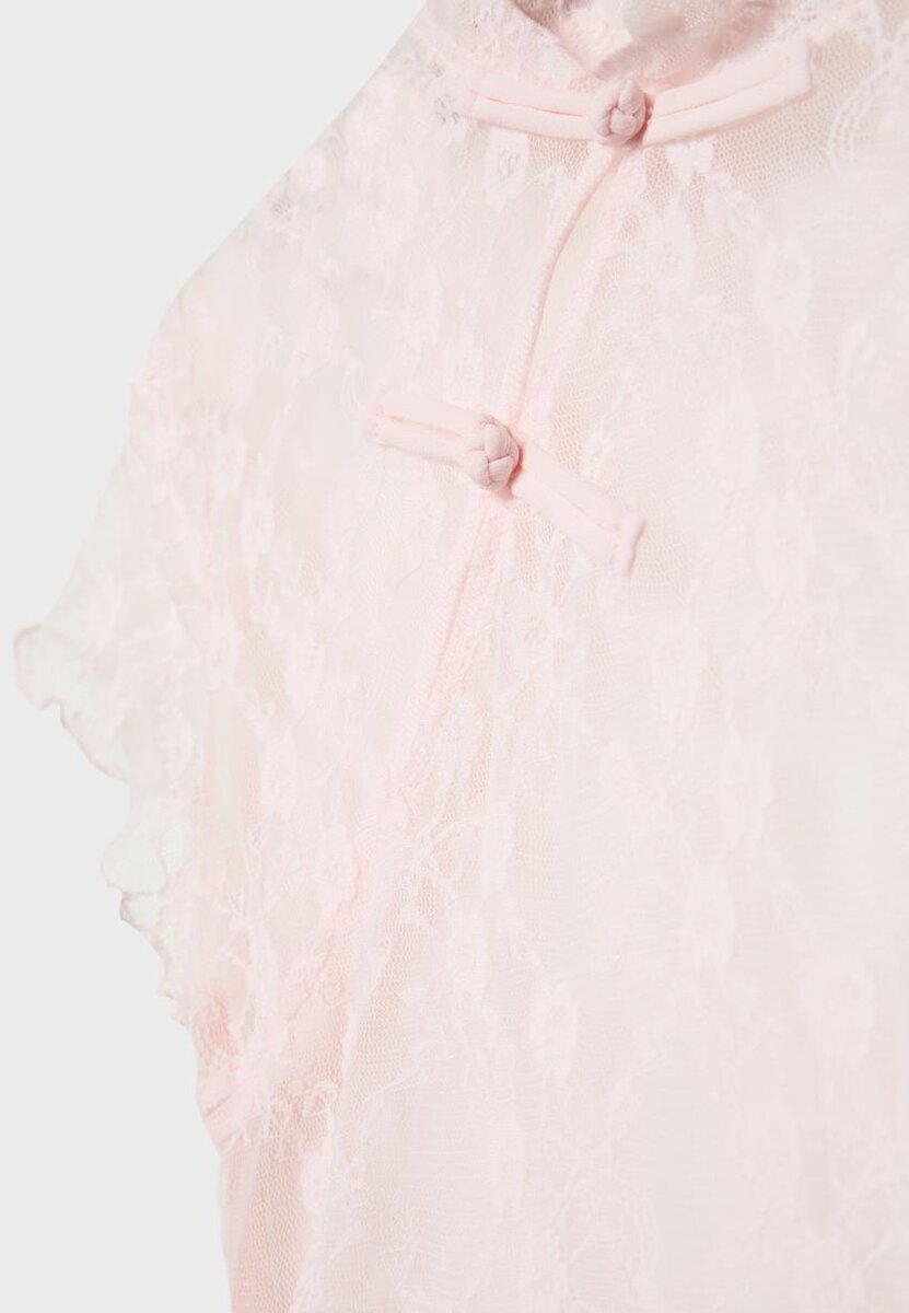 Tettsittende T-skjorte laget av blonderstoff. Stående krage og korte ermer. Lukking foran med løkker i nakken. Justerbar kant med bånd i sidene. Tilgjengelig i ulike farger.