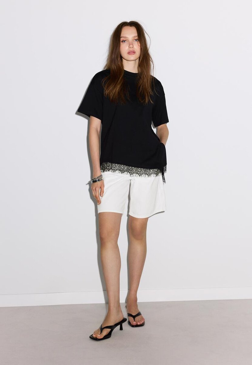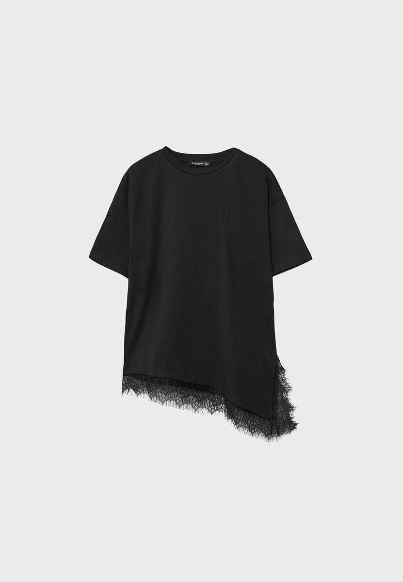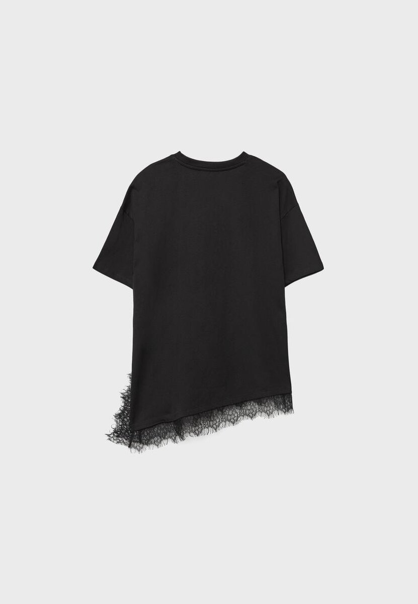 T-skjorte i oversize-passform med rund hals og korte ermer. Med asymmetrisk kant med blonder. Tilgjengelig i ulike farger.